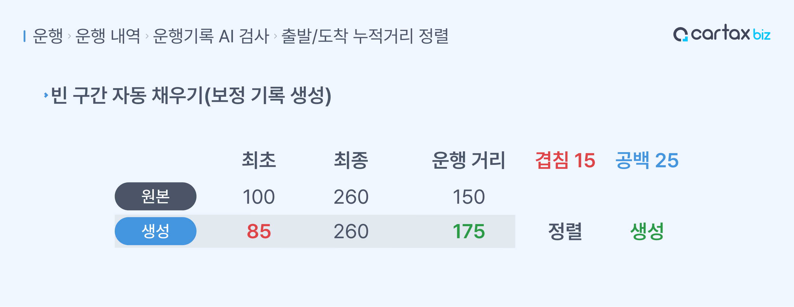 공백 구간의 운행기록을 생성합니다.운행 기록 생성 후, 운행기록은 겹침/공백 없도록 정렬됩니다.