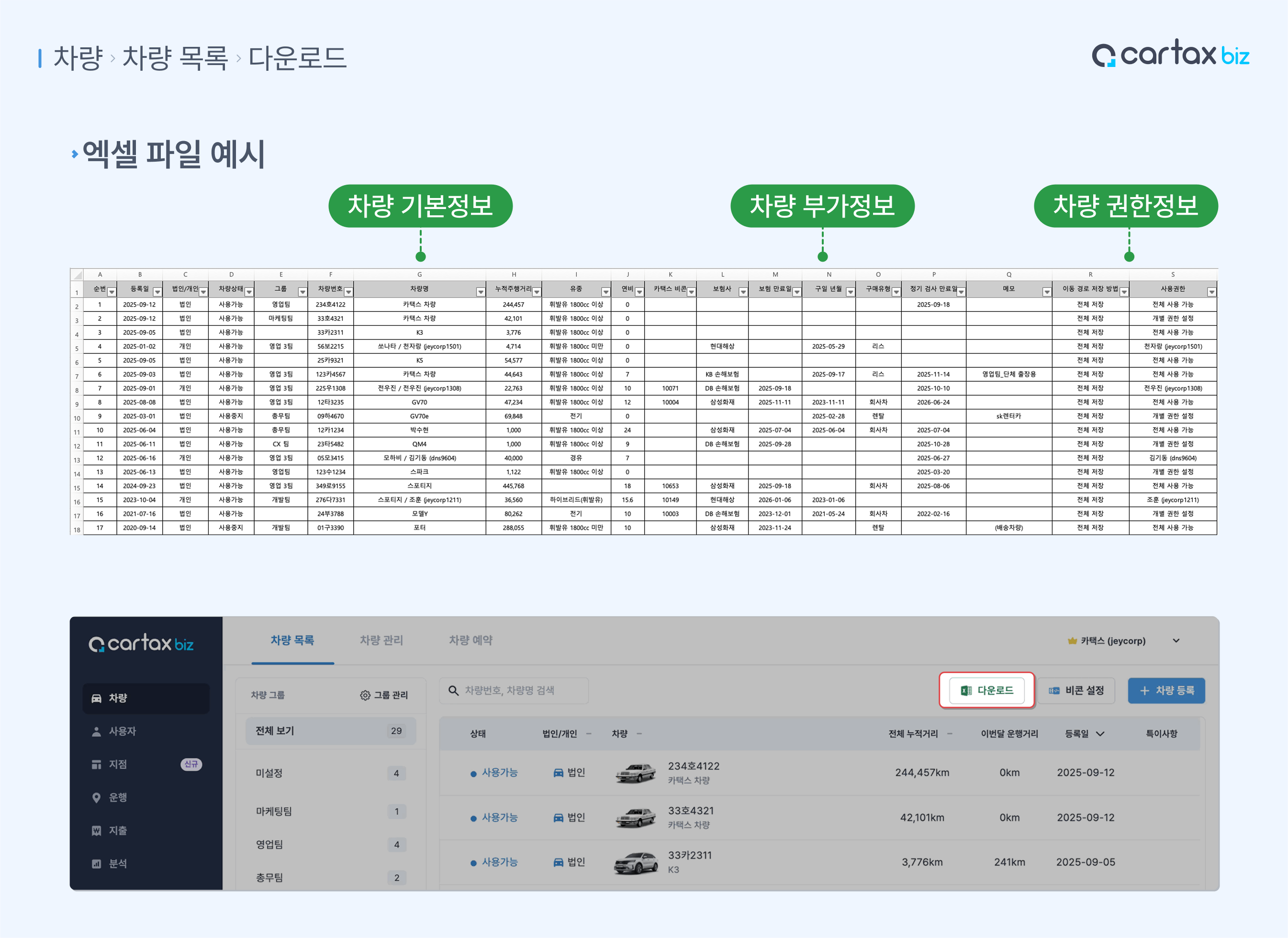 등록된 차량 정보를 Excel 파일로 받아볼 수 있어요.