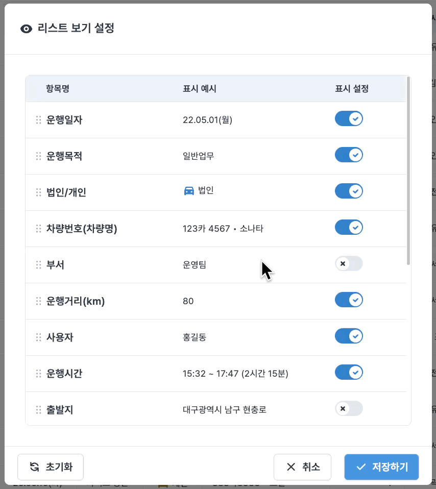 운행 목록에서 표시할 정보(열)를 선택할 수 있어요.
