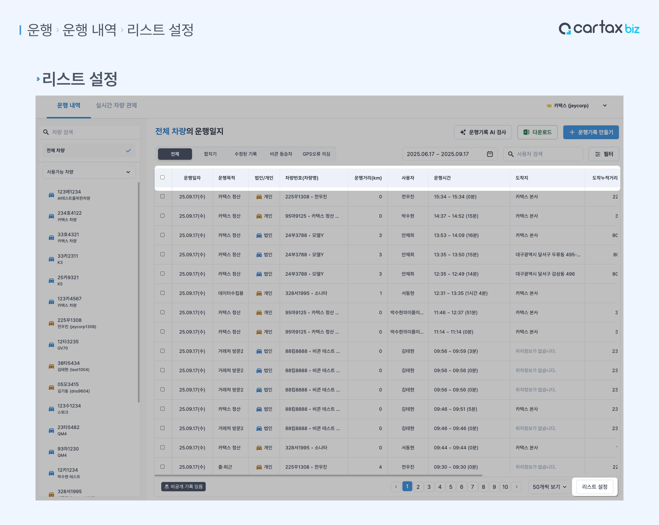 위치 : 운행 > 운행 내역 > 리스트 설정