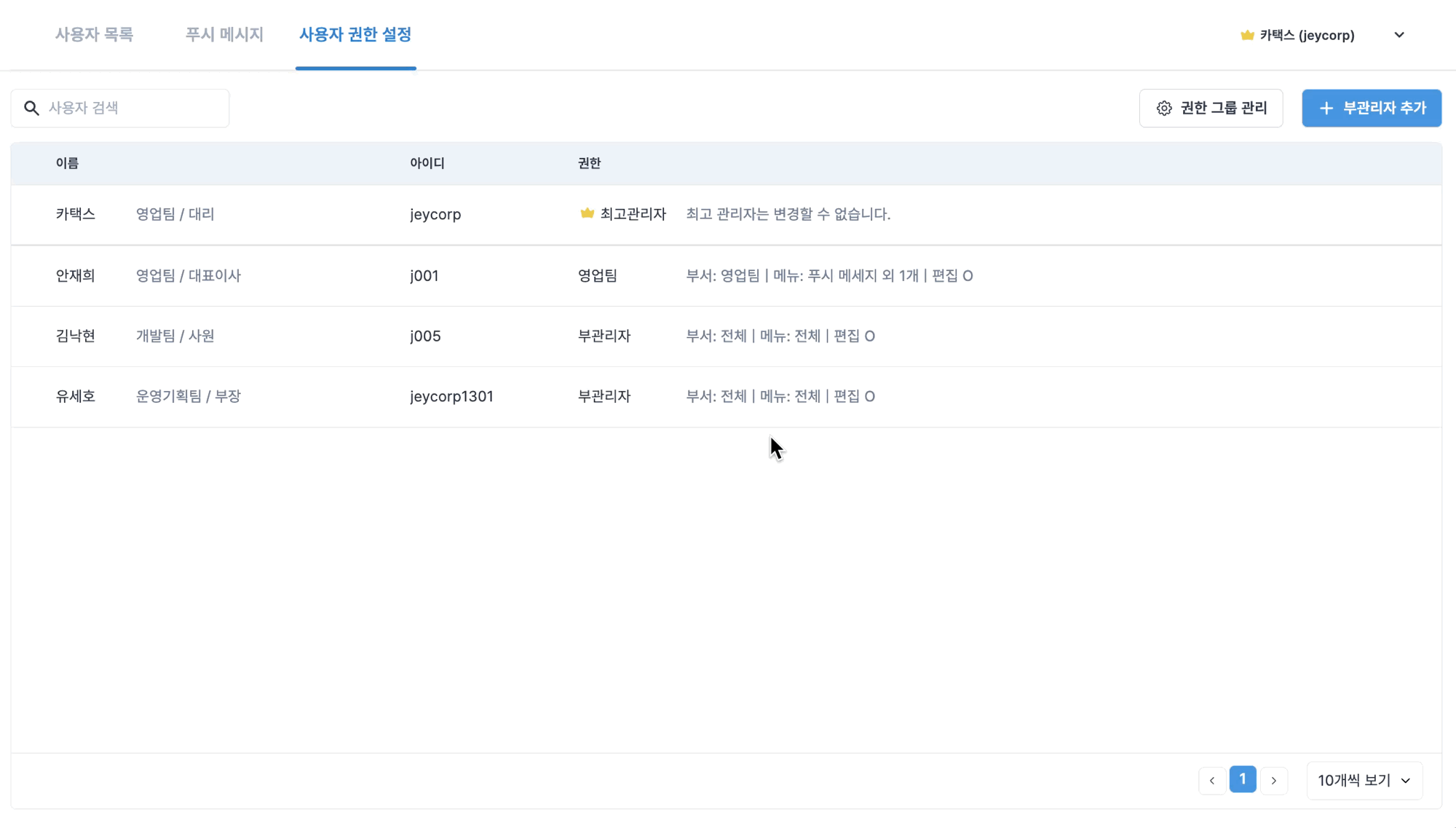 현재 시스템에서 부관리자 추가는 사용자에게 권한 그룹을 할당하는 기능 입니다!