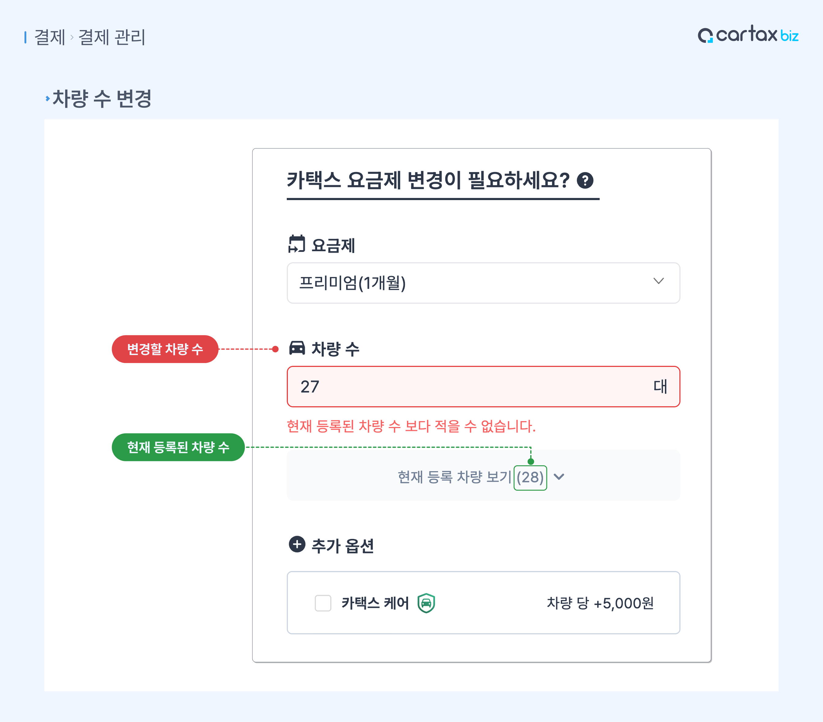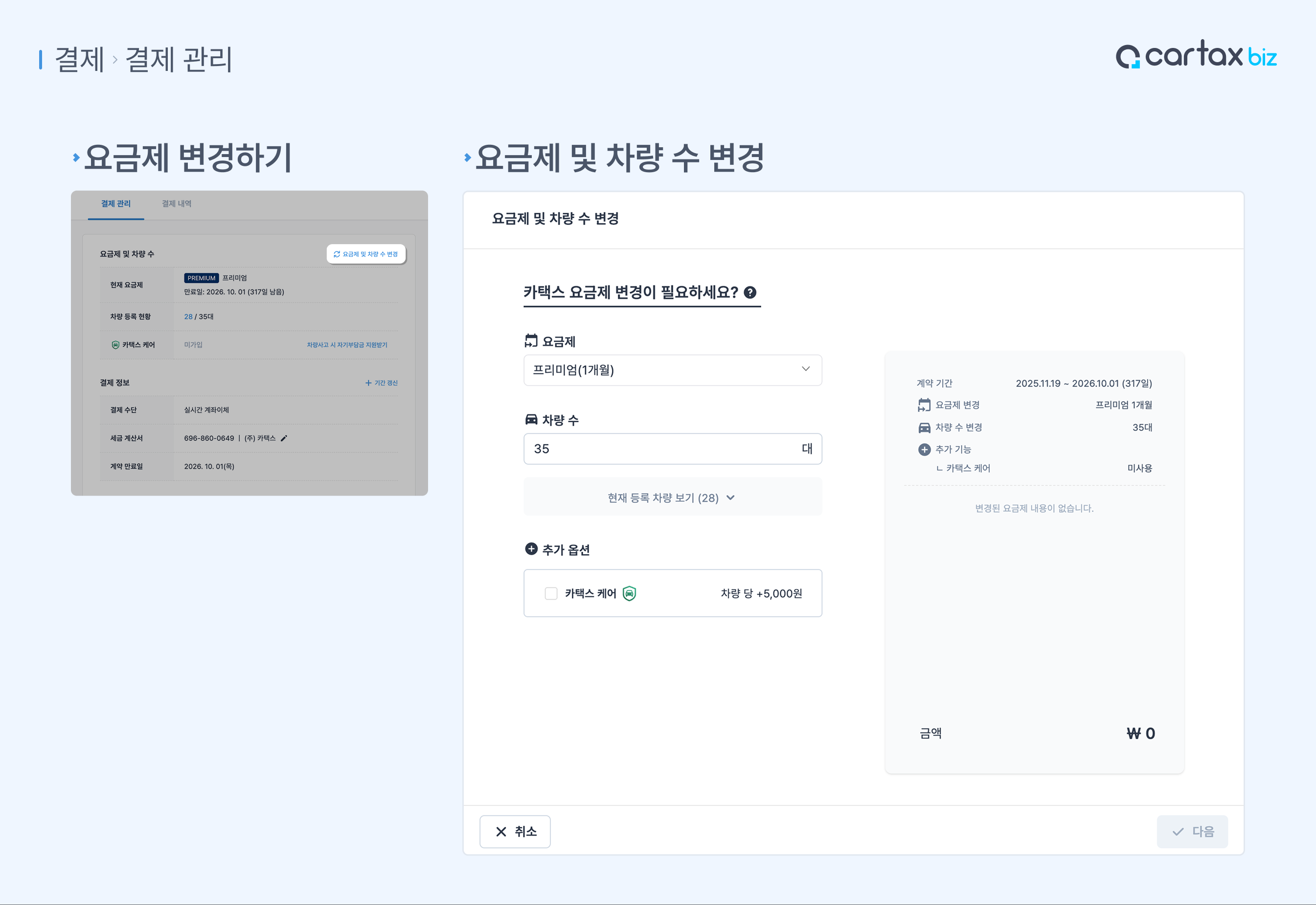 위치 : 위치 : 결제 > 결제 관리 > 요금제 및 차량 수 변경