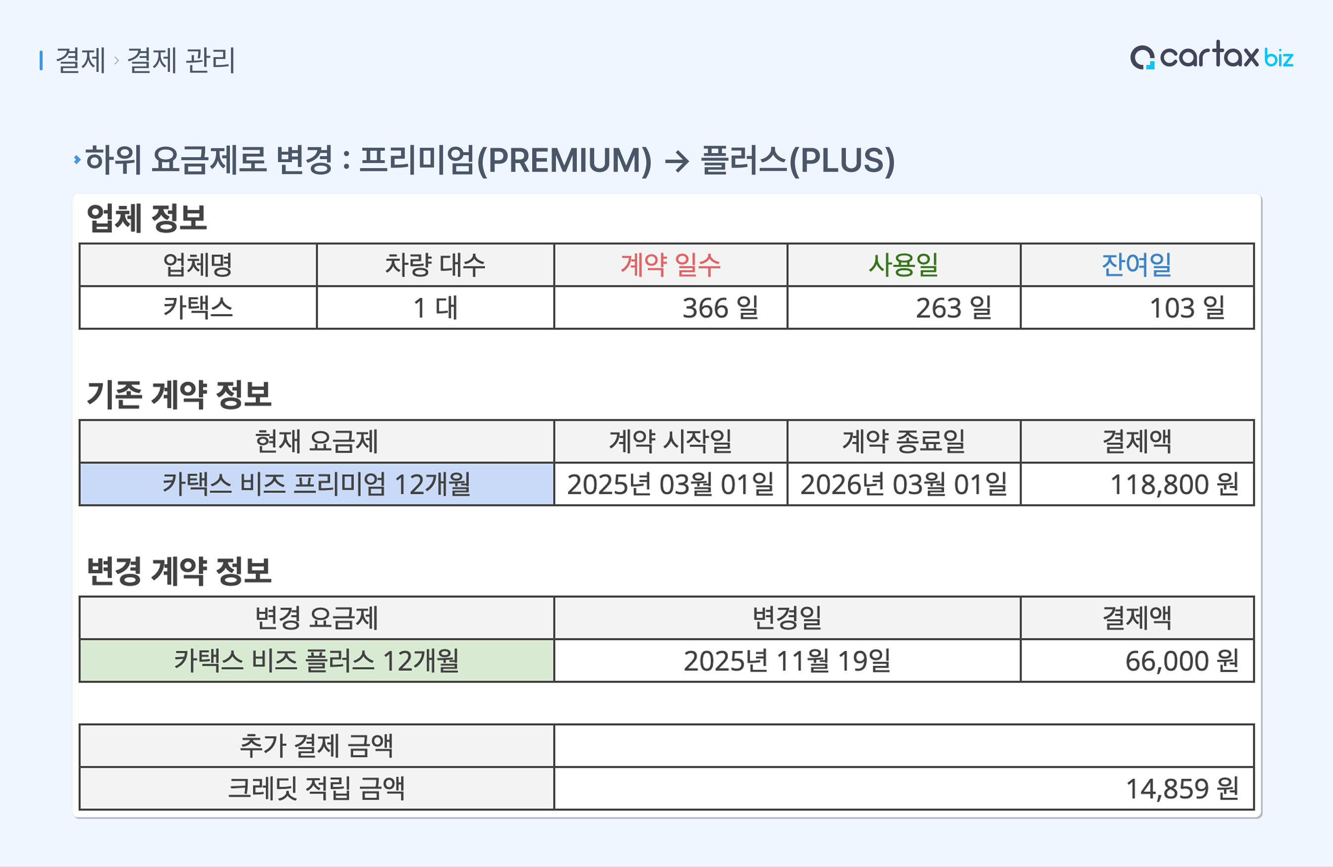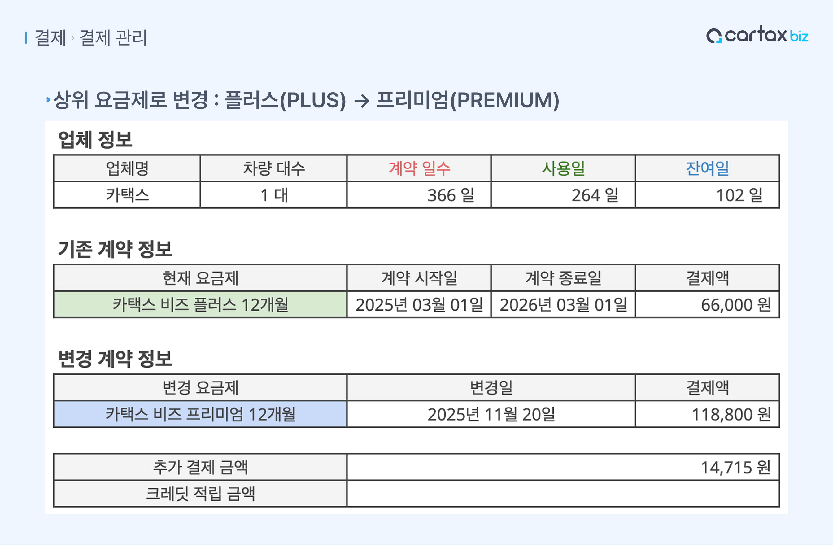 요금제 또는 차량 수를 변경하는 경우, 현재 계약의 종료일로부터 남은 기간을 계산하여 추가 결제 또는 차감 정산 됩니다.