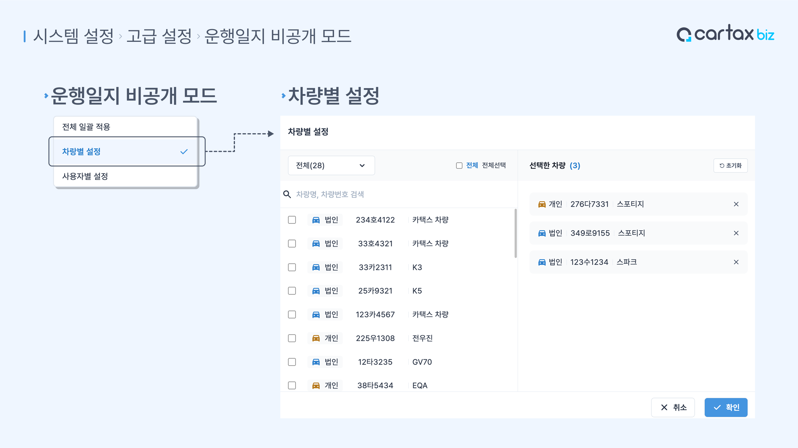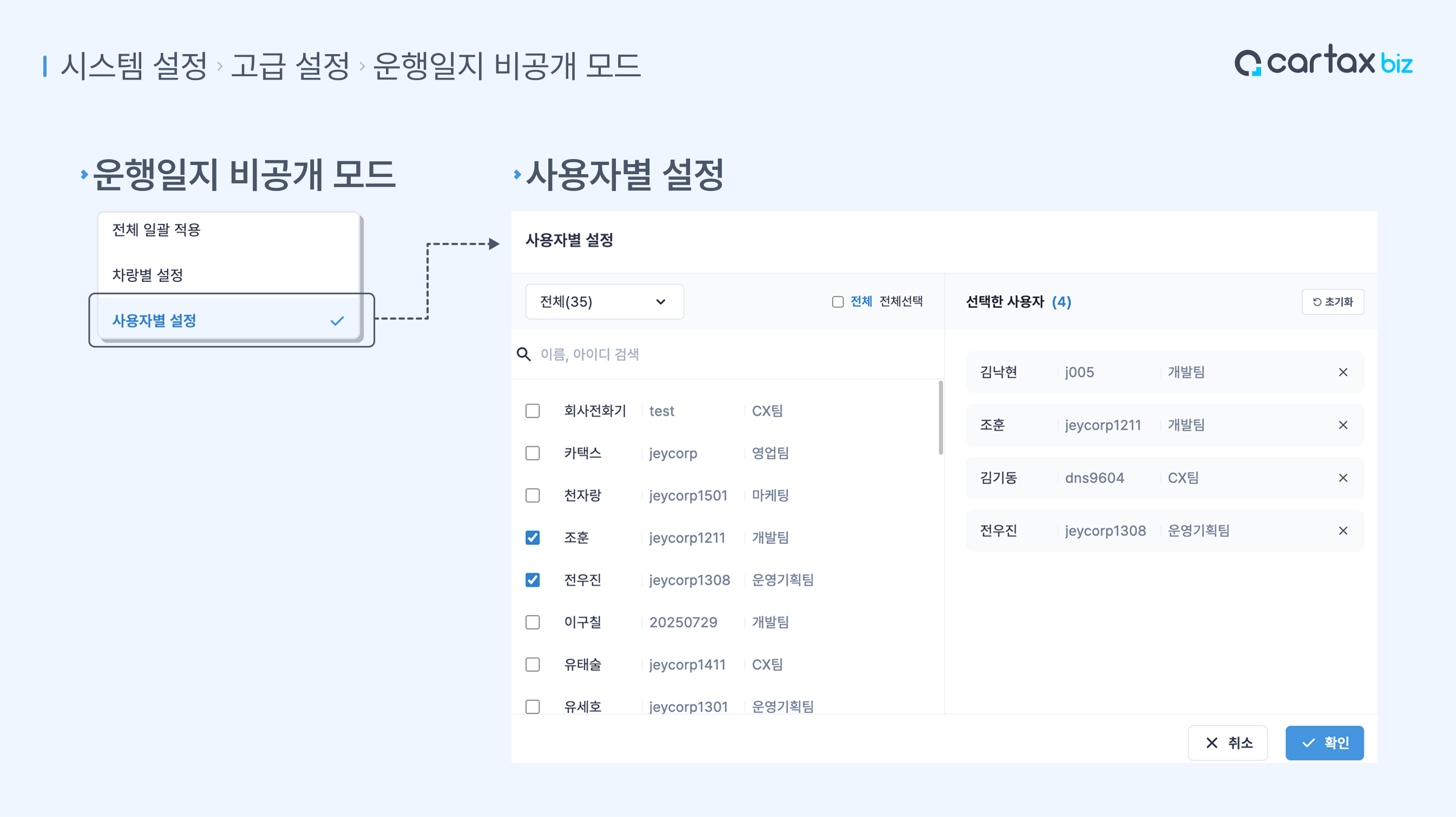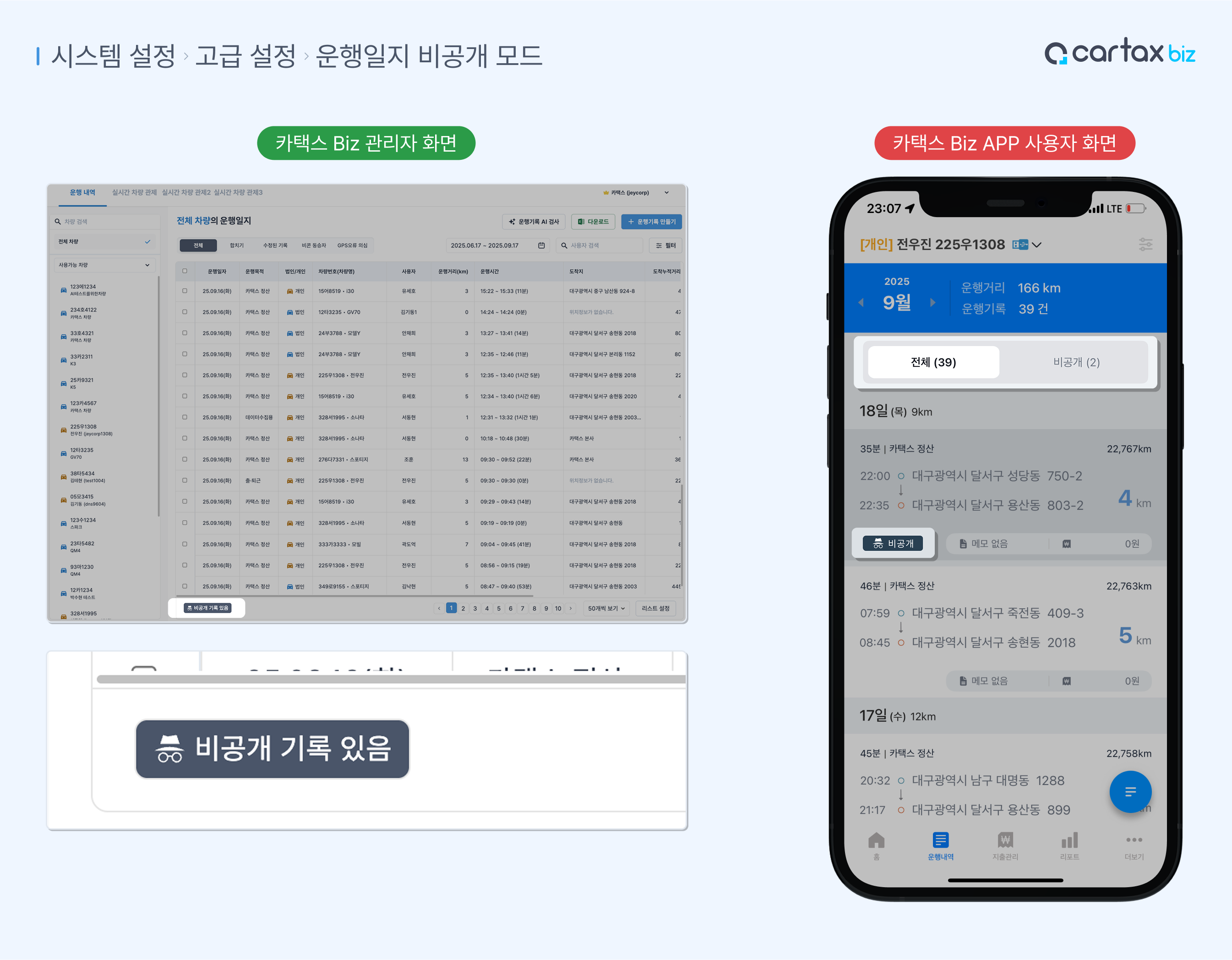 카택스 Biz APP을 사용하는 모든 사용자의 기록은 기본 '비공개' 모드로 저장돼요.