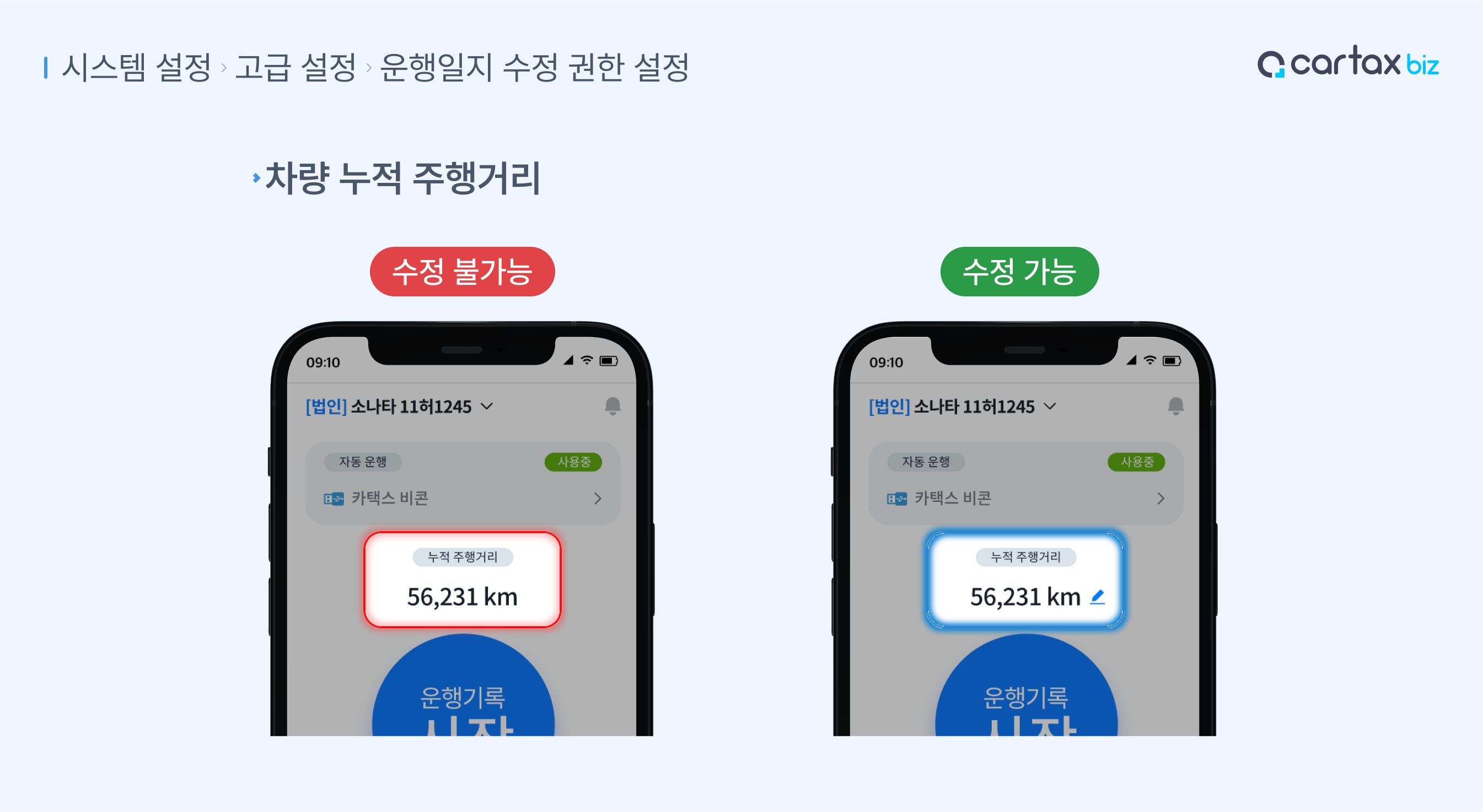 카택스 Biz APP '메인 화면'에 있는 차량의 누적 주행 거리 수정하는 권한이에요.