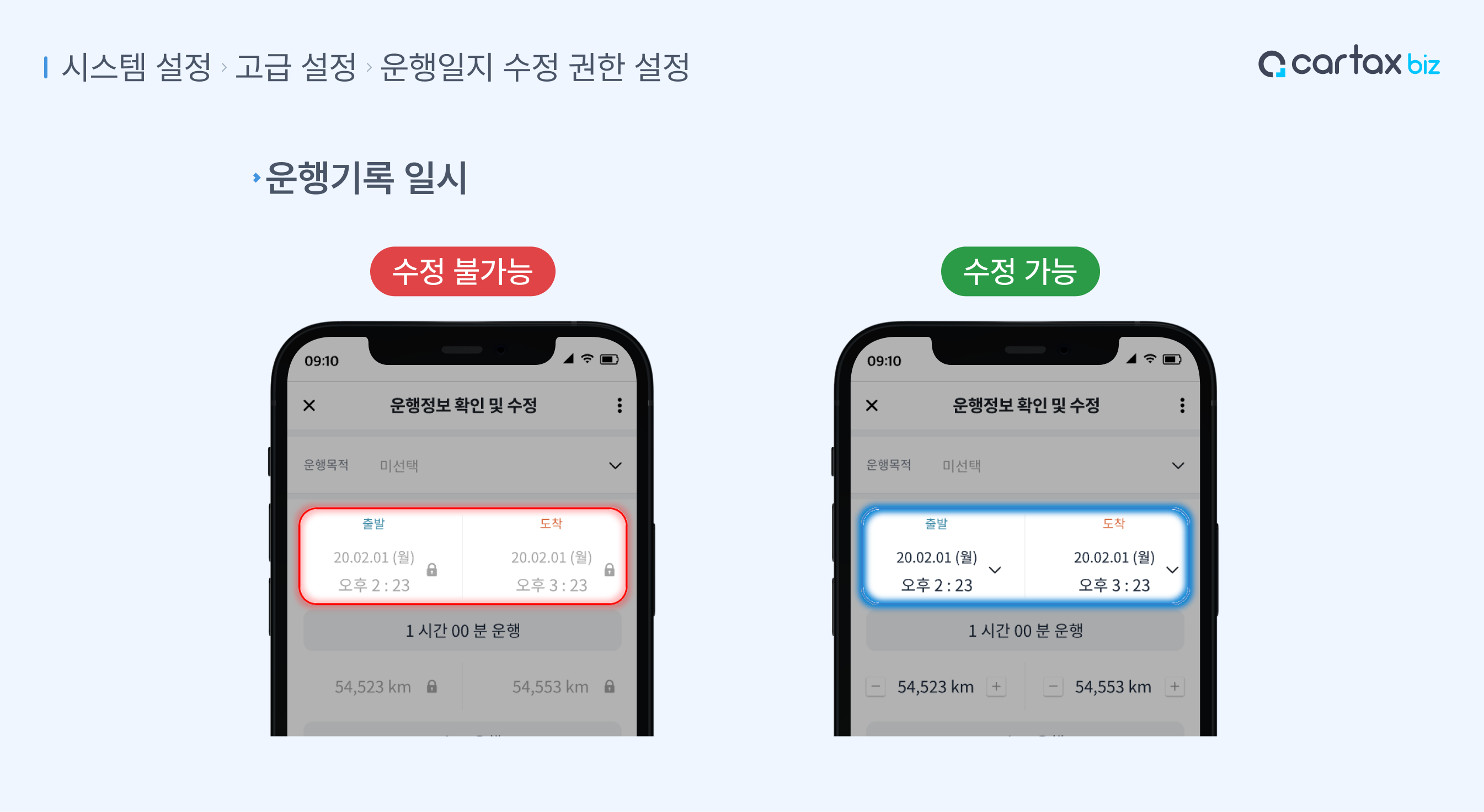 차량 누적 거리,운행 기록 일시,운행 기록 거리의 수정 권한을 설정해 보세요.