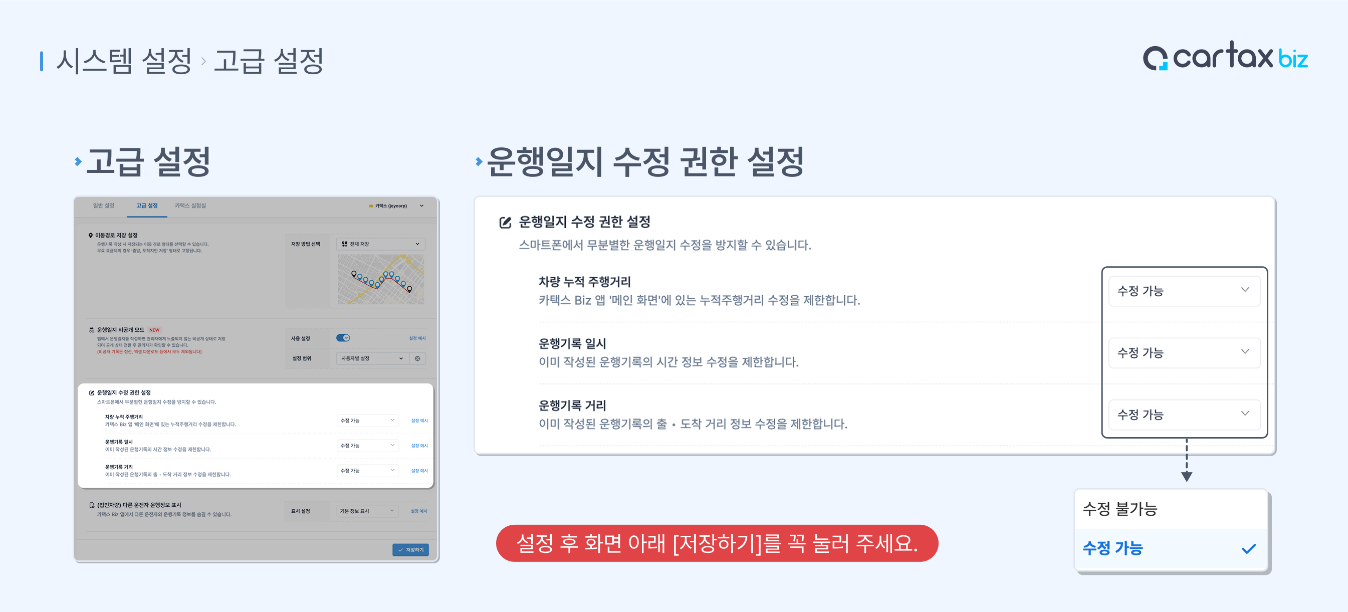 위치 : 시스템 설정 > 고급 설정 > 운행일지 수정 권한 설정