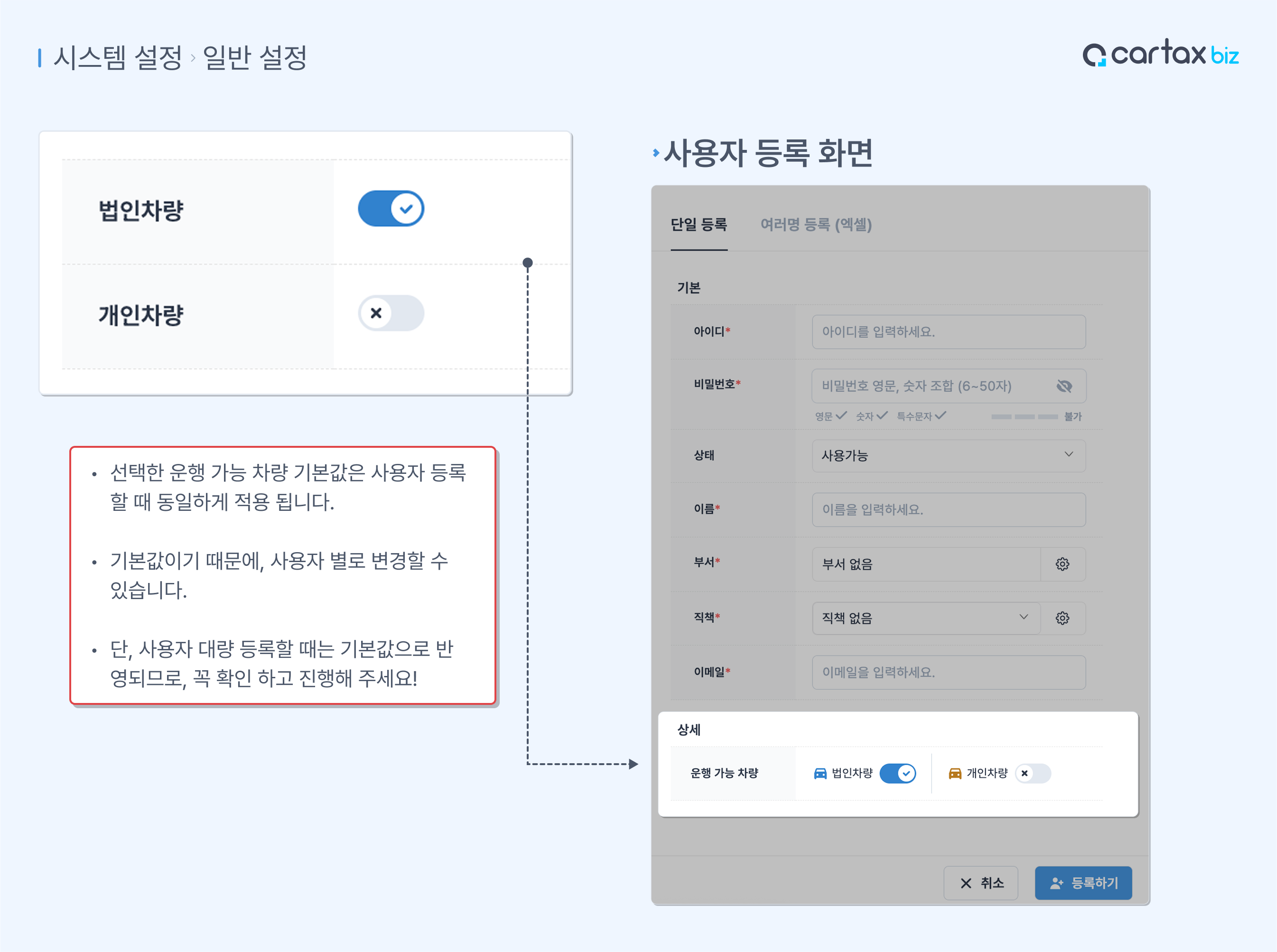 카택스 Biz APP에서 사용자 회원가입 시 반영되는 기본 값