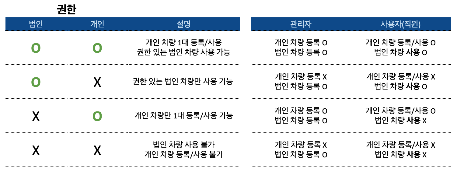 운행 가능 차량 → 법인 차량 or 개인 차량