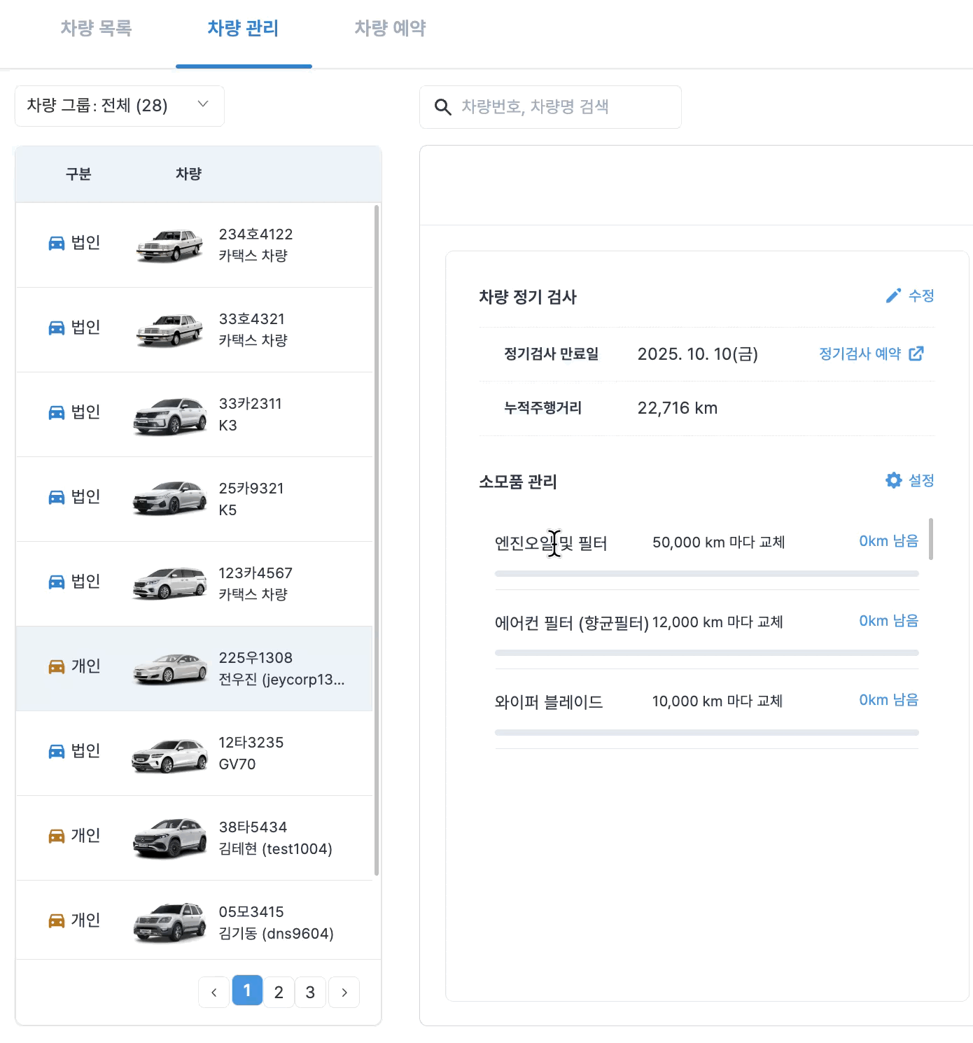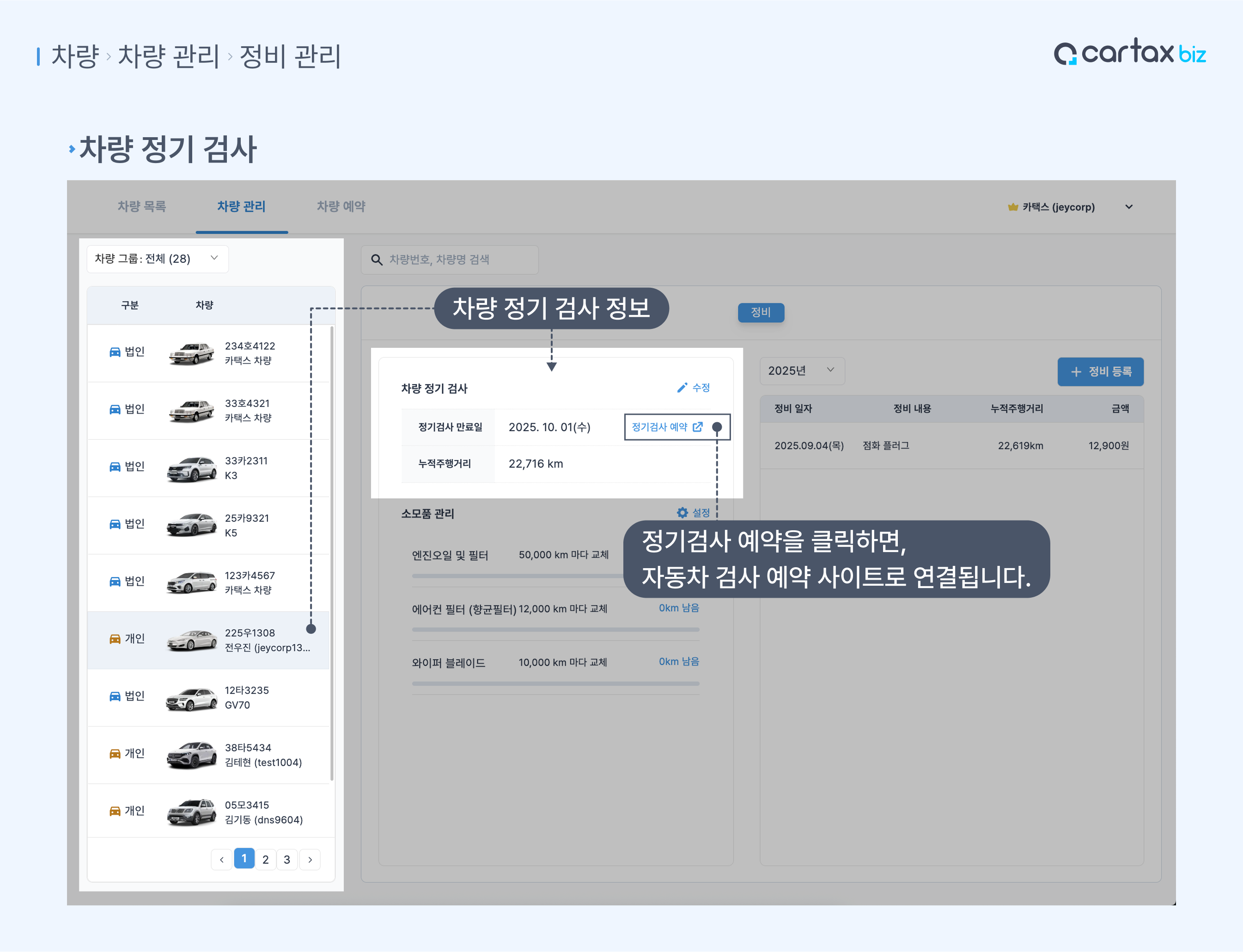 차량의 정기검사 만료일을 등록하거나 차량 정기검사를 예약할 수 있어요.