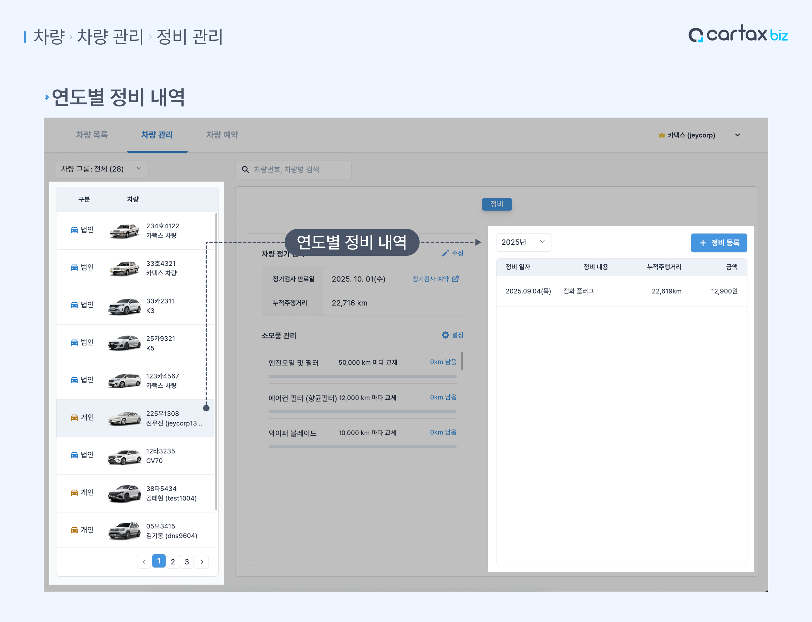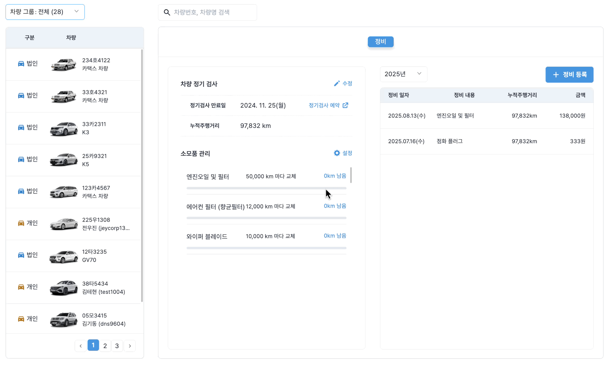 차량 별 승인된 정비 내역을 연도별로 확인할 수 있습니다.