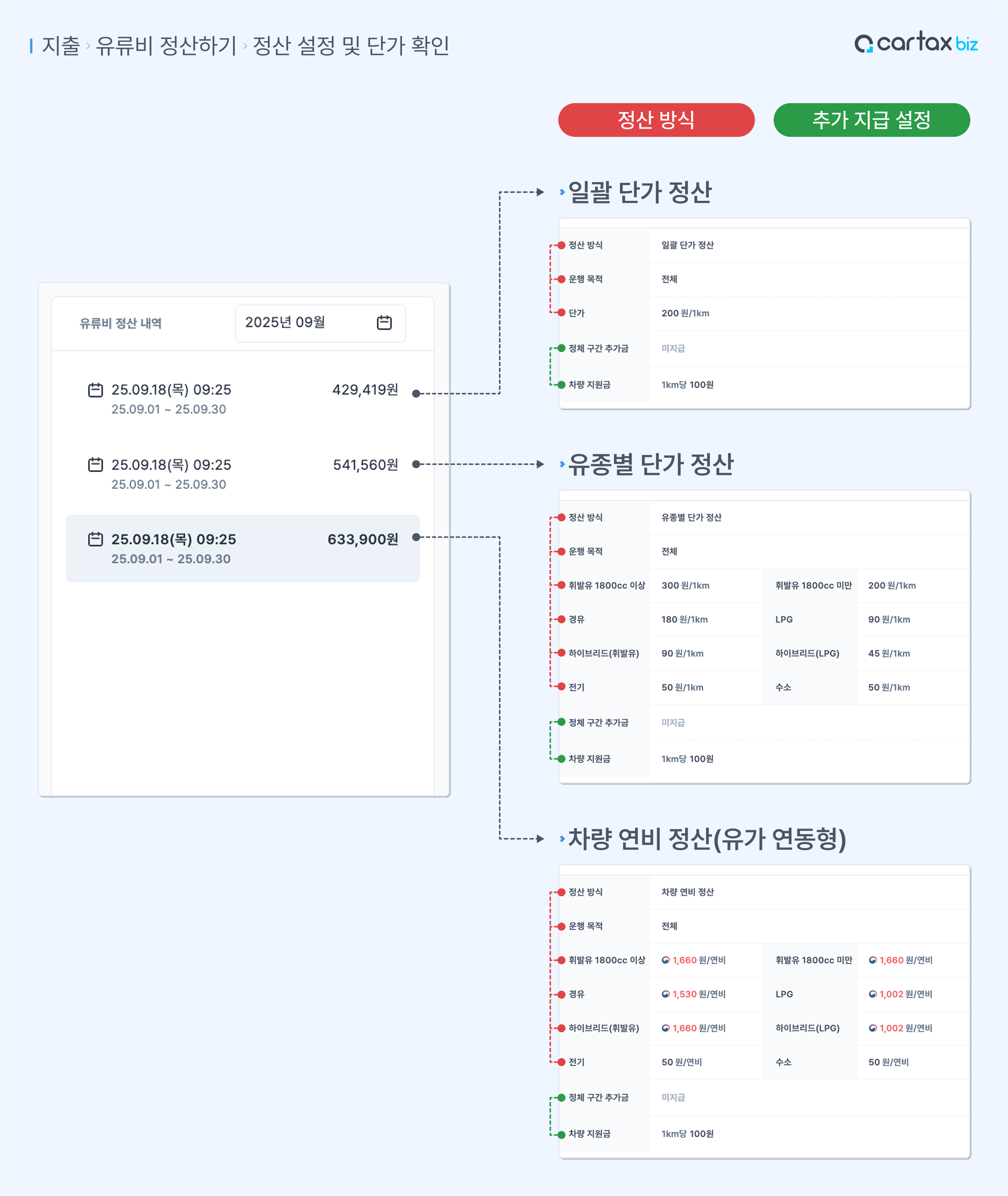 각 정산 방식에 따라 어떤 기준으로 작성되었는지 상세 내용을 확인 할 수 있습니다.