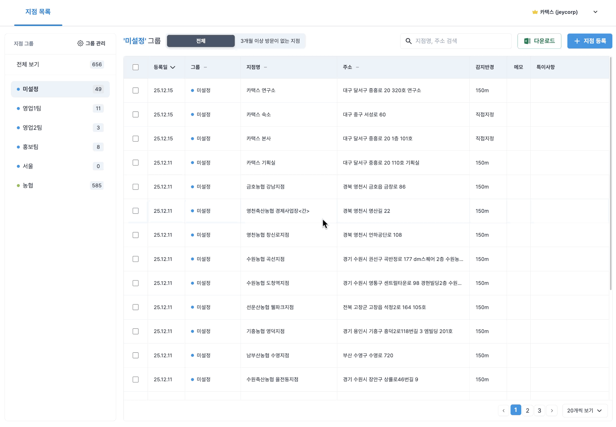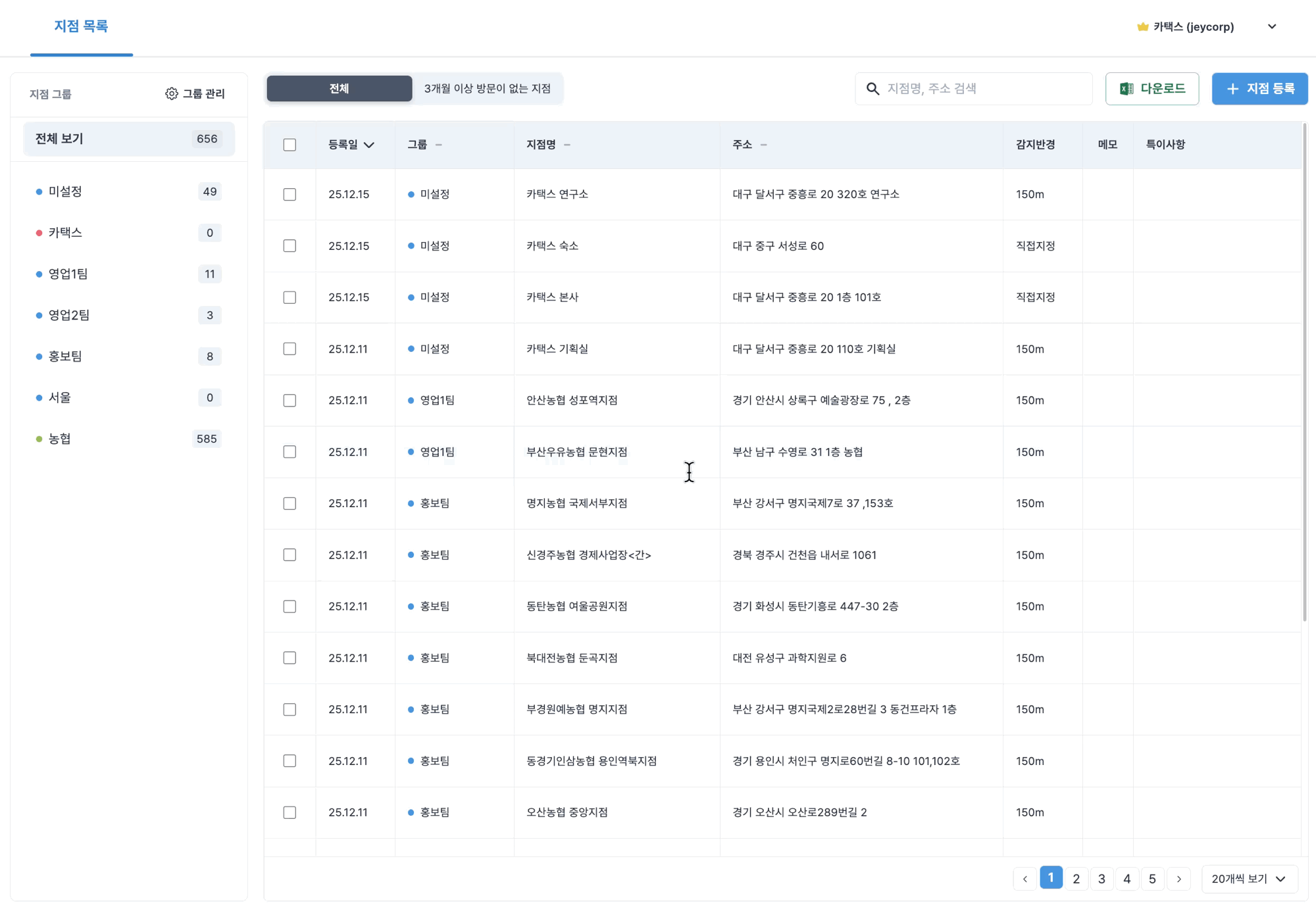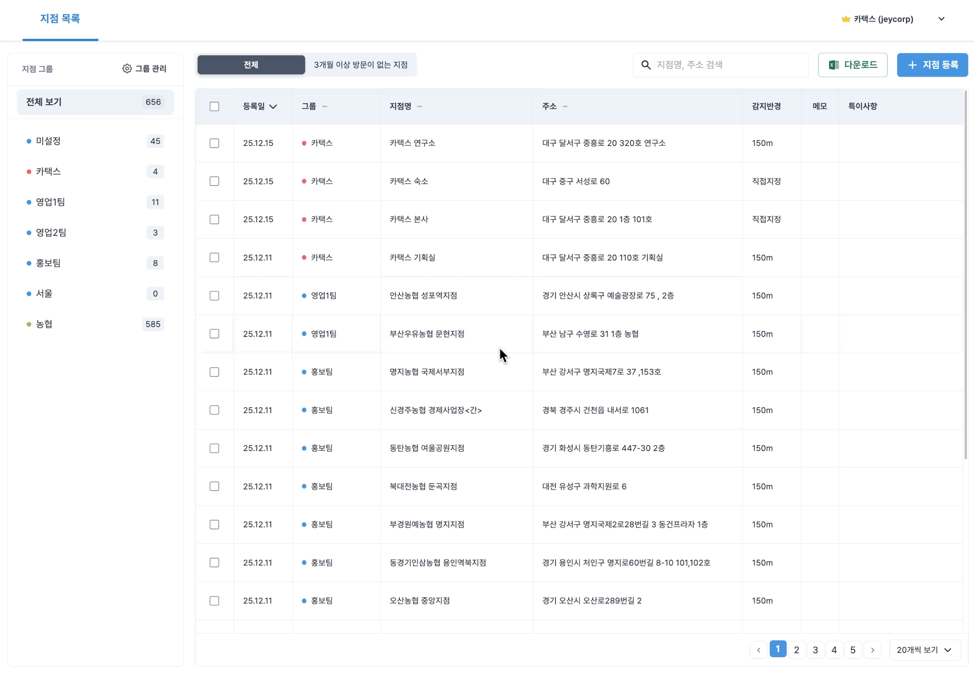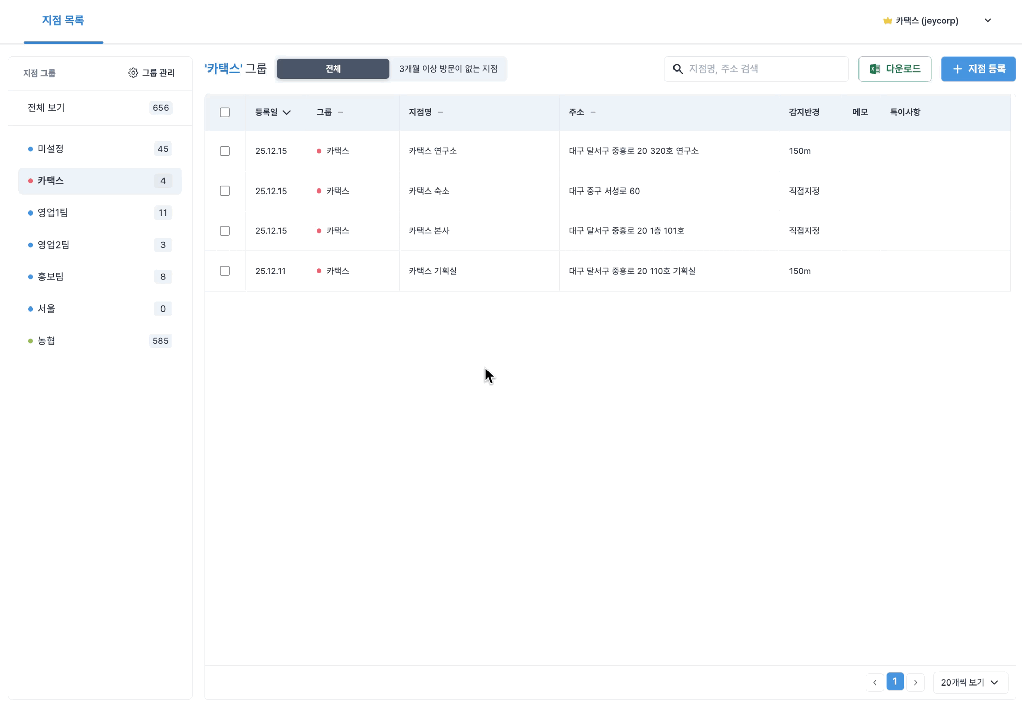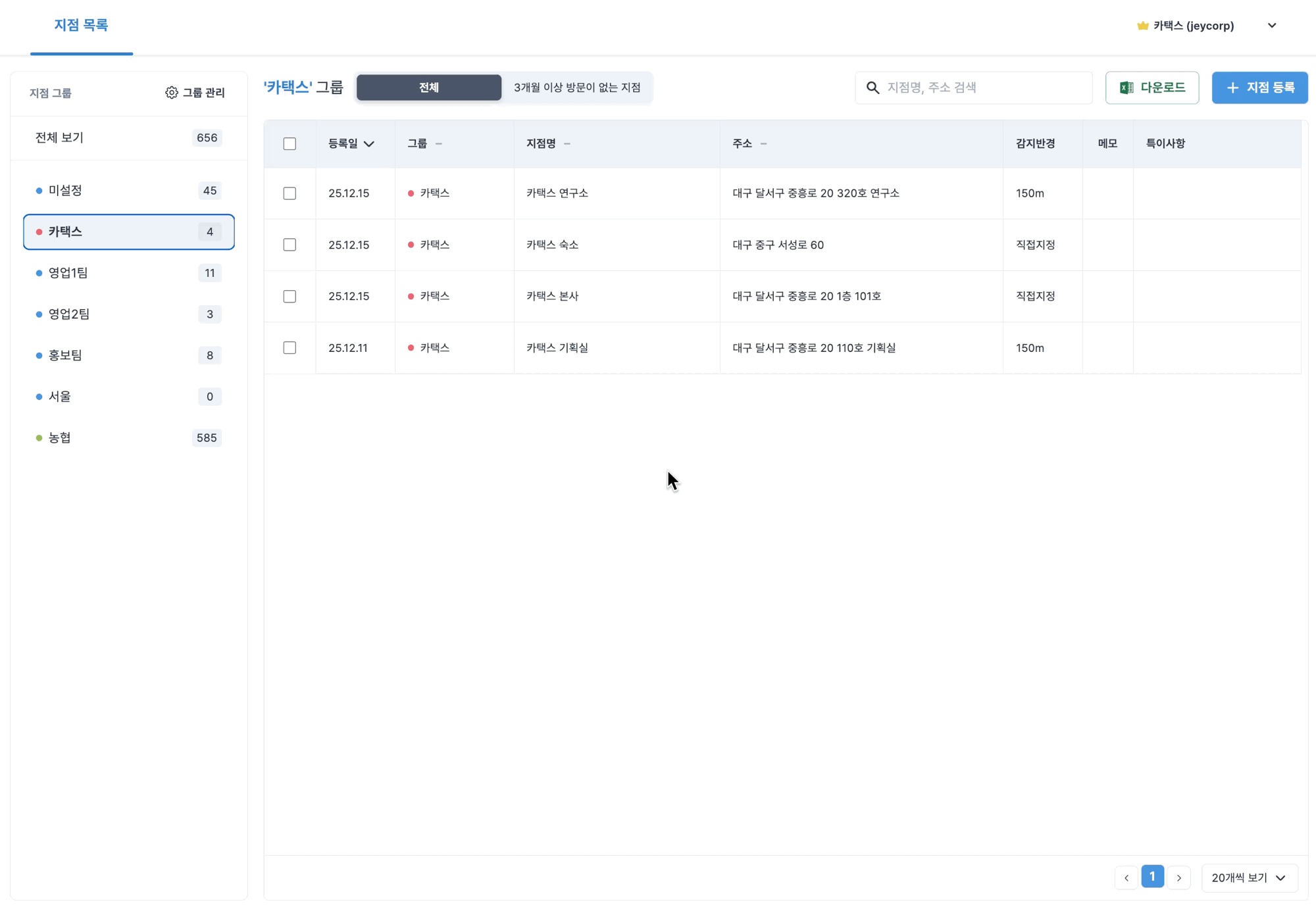 등록된 지점에 그룹을 설정해 체계적으로 관리할 수 있습니다.