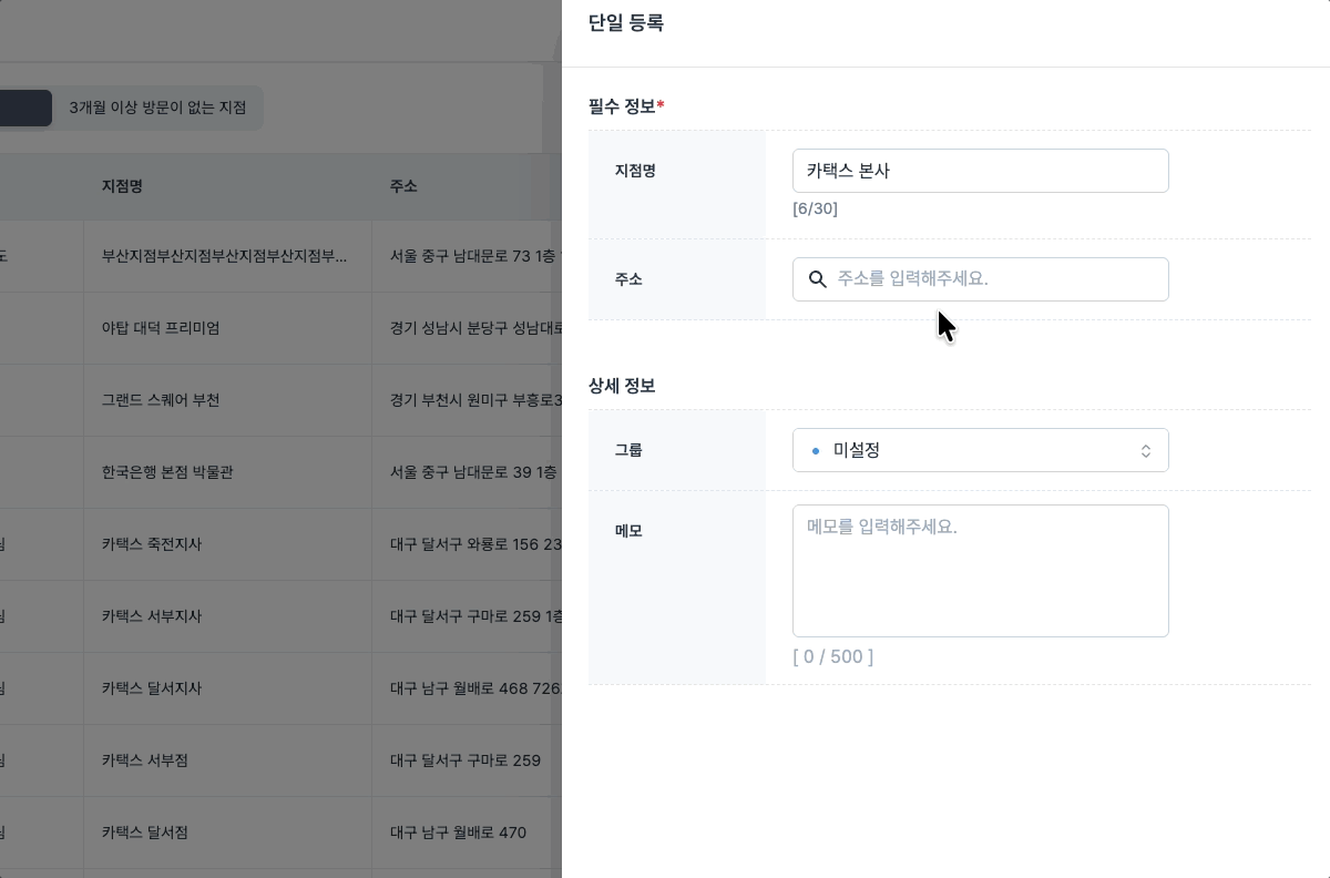 지점메뉴에서지점 등록버튼을 클릭해요.거래처나 지사 등 관리가 필요한 주소를 검색하고 지점명을 부여해 보세요.