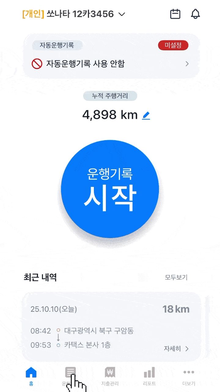 운전자는 카택스 APP에서 운행기록 작성 후 지점을 확인하거나 변경할 수 있습니다.