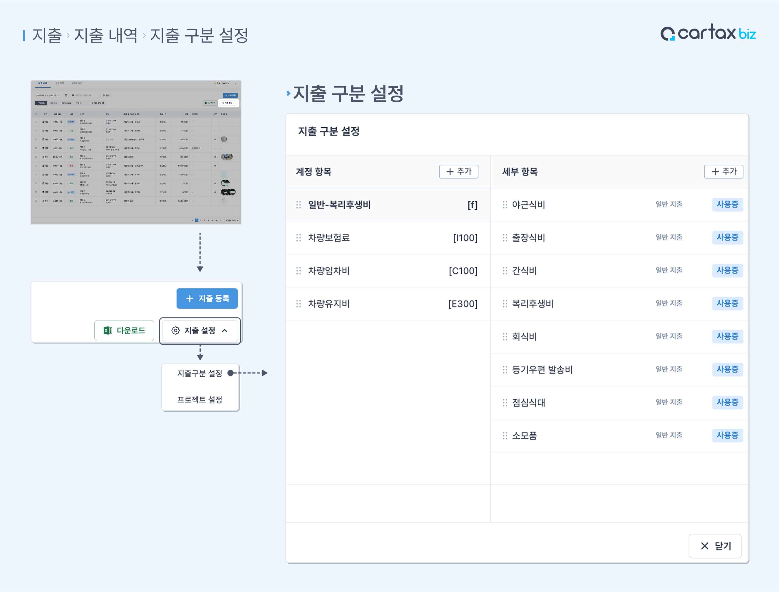 조직의 비용 처리 기준에 따라 지출 계정과 항목을 미리 설정해 효율적으로 관리하세요.