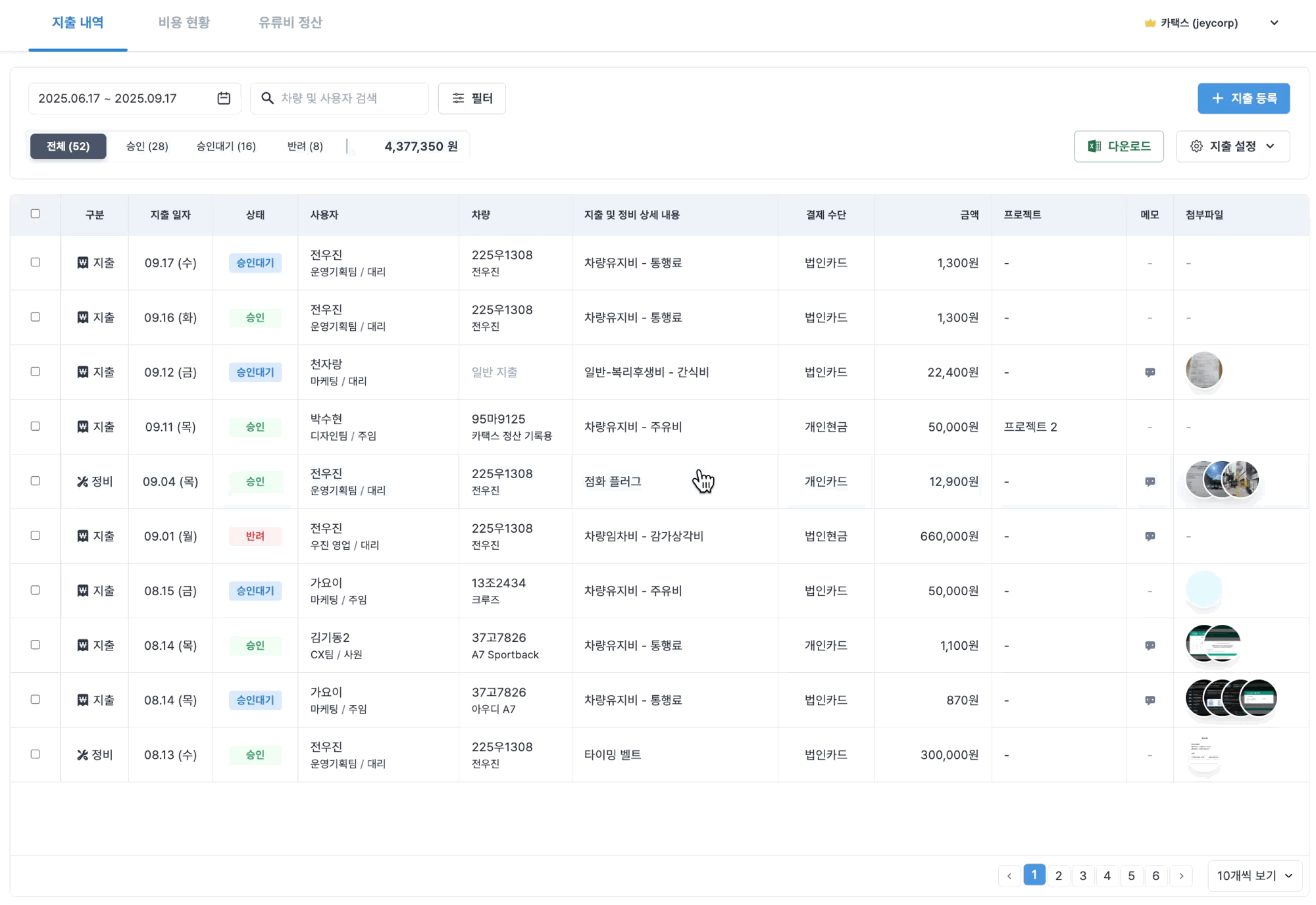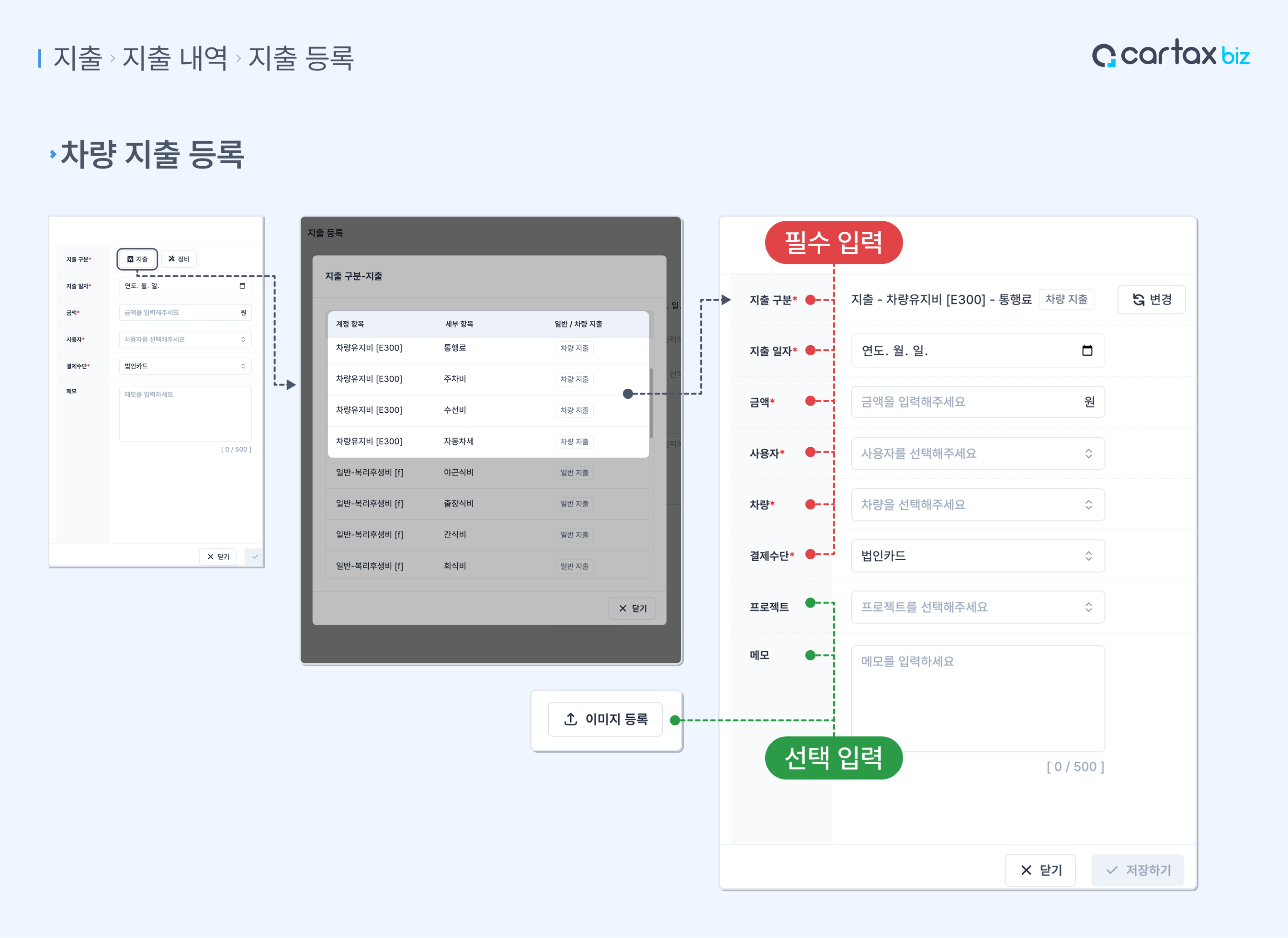 차량 지출)지출 일자, 금액, 사용자, 결제 수단 입력/선택