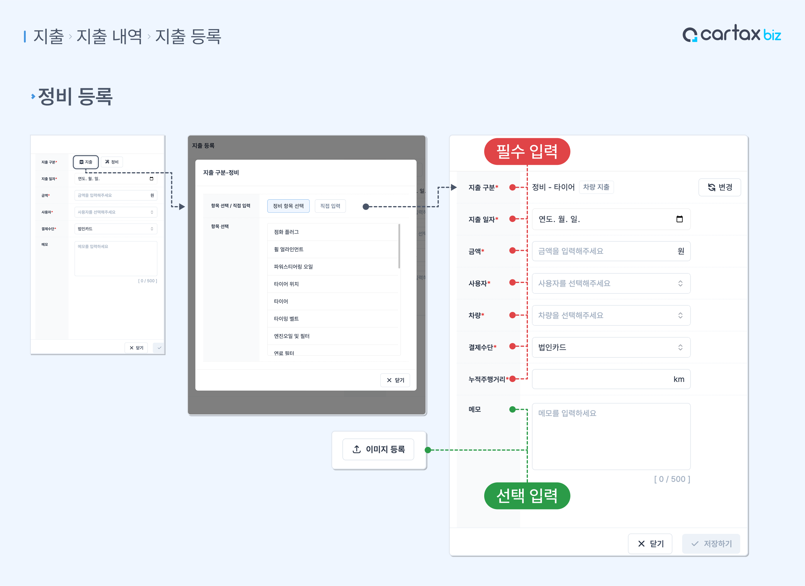 정비 지출)지출 일자, 금액, 사용자, 결제 수단 입력/선택