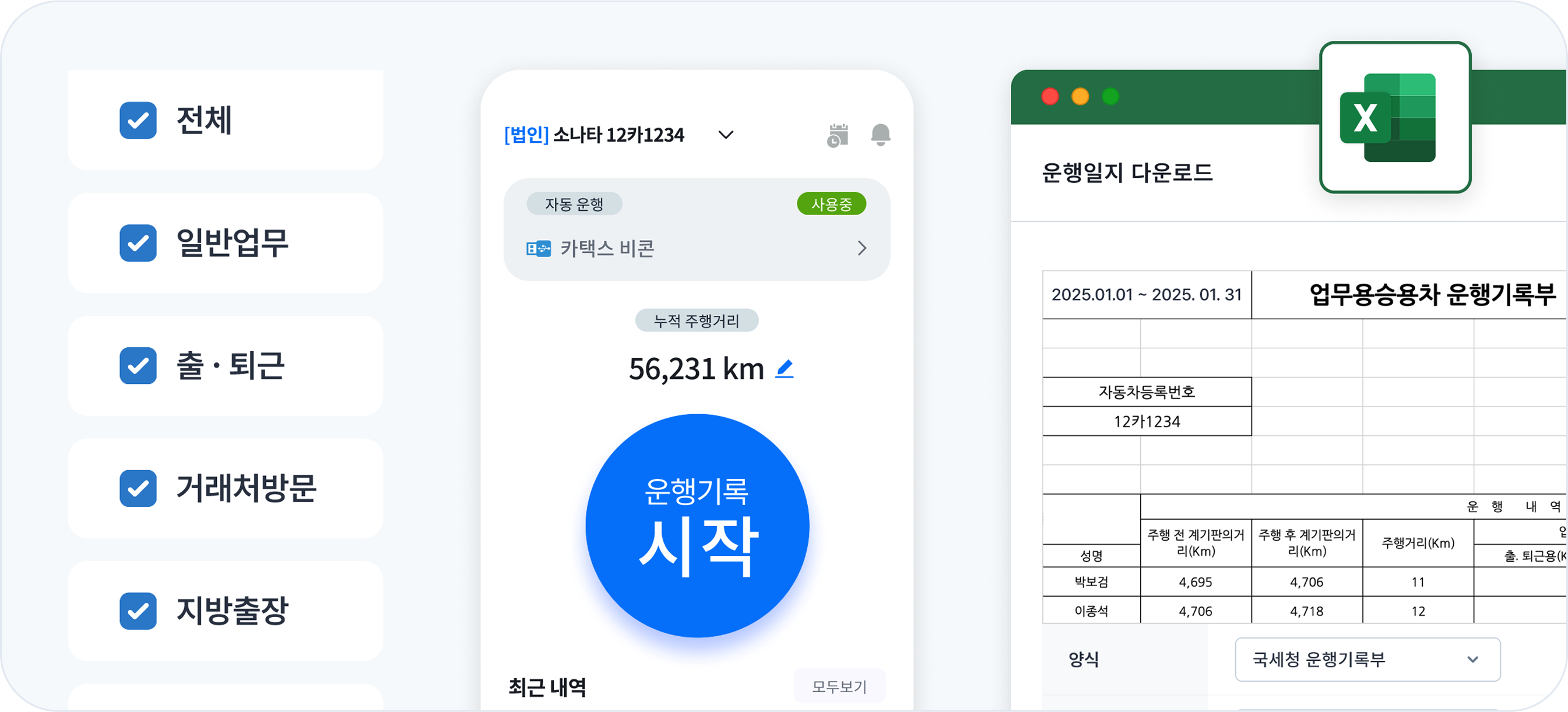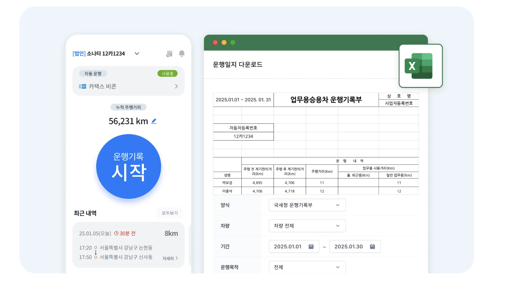 - 기록된 운행 내역을 국세청 운행일지 양식으로 클릭 한 번으로 다운 받으세요.