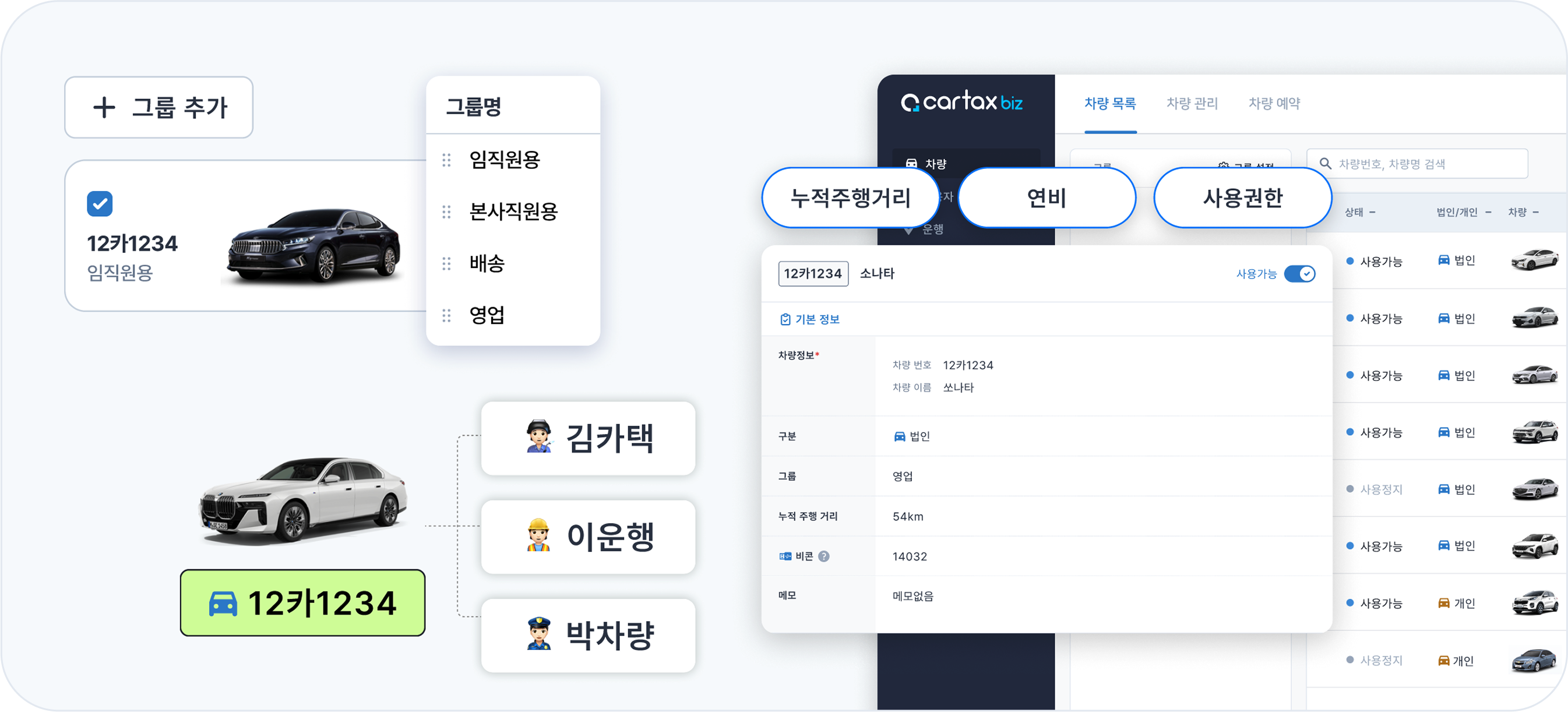 - 업무에 사용되는 법인/개인 차량과 사용자 정보를 등록/관리할 수 있어요.