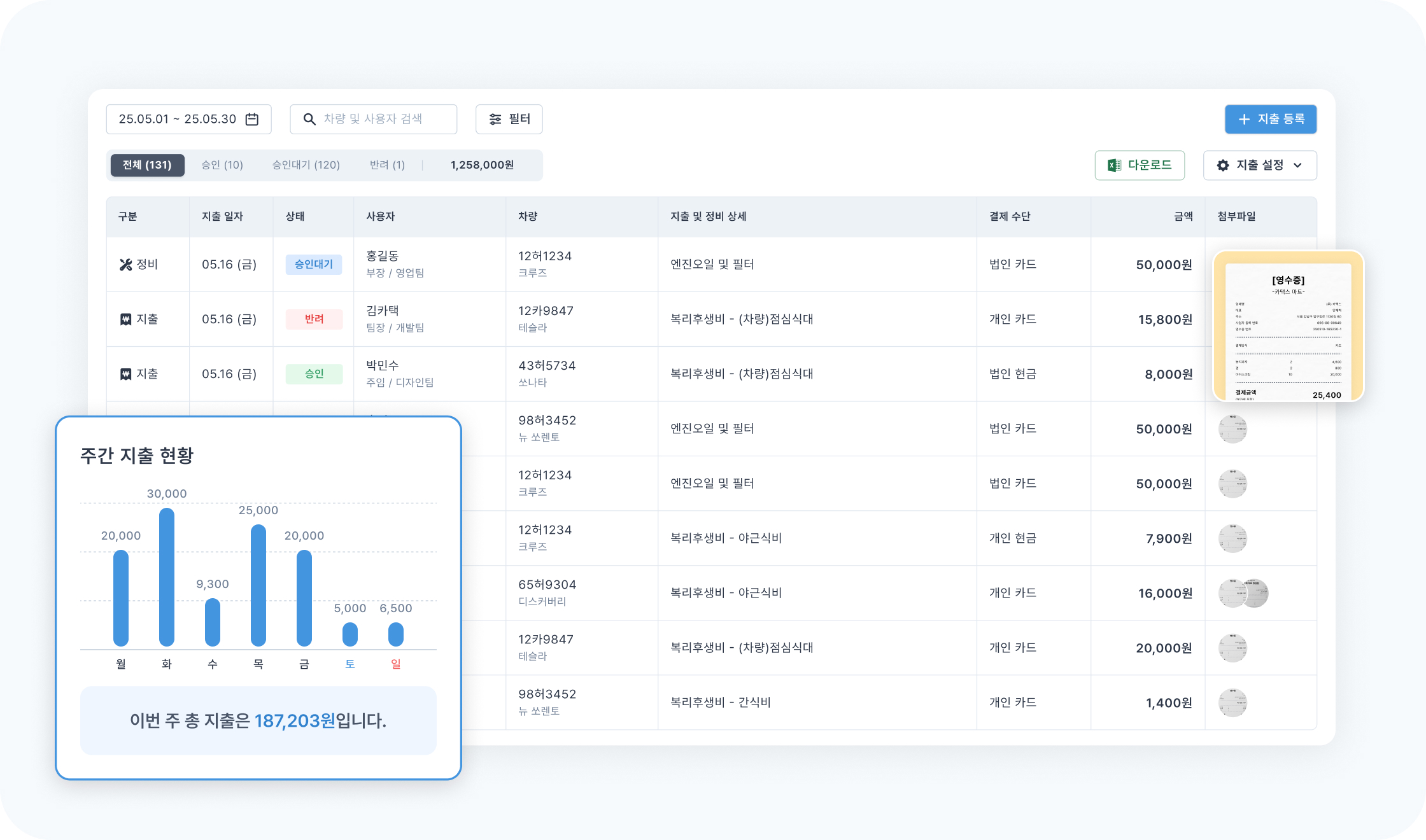 - 사용자(직원)의 유류비, 통행비 등 비용 정산 기능은 업무를 더욱 효율적으로 만들어 드려요.