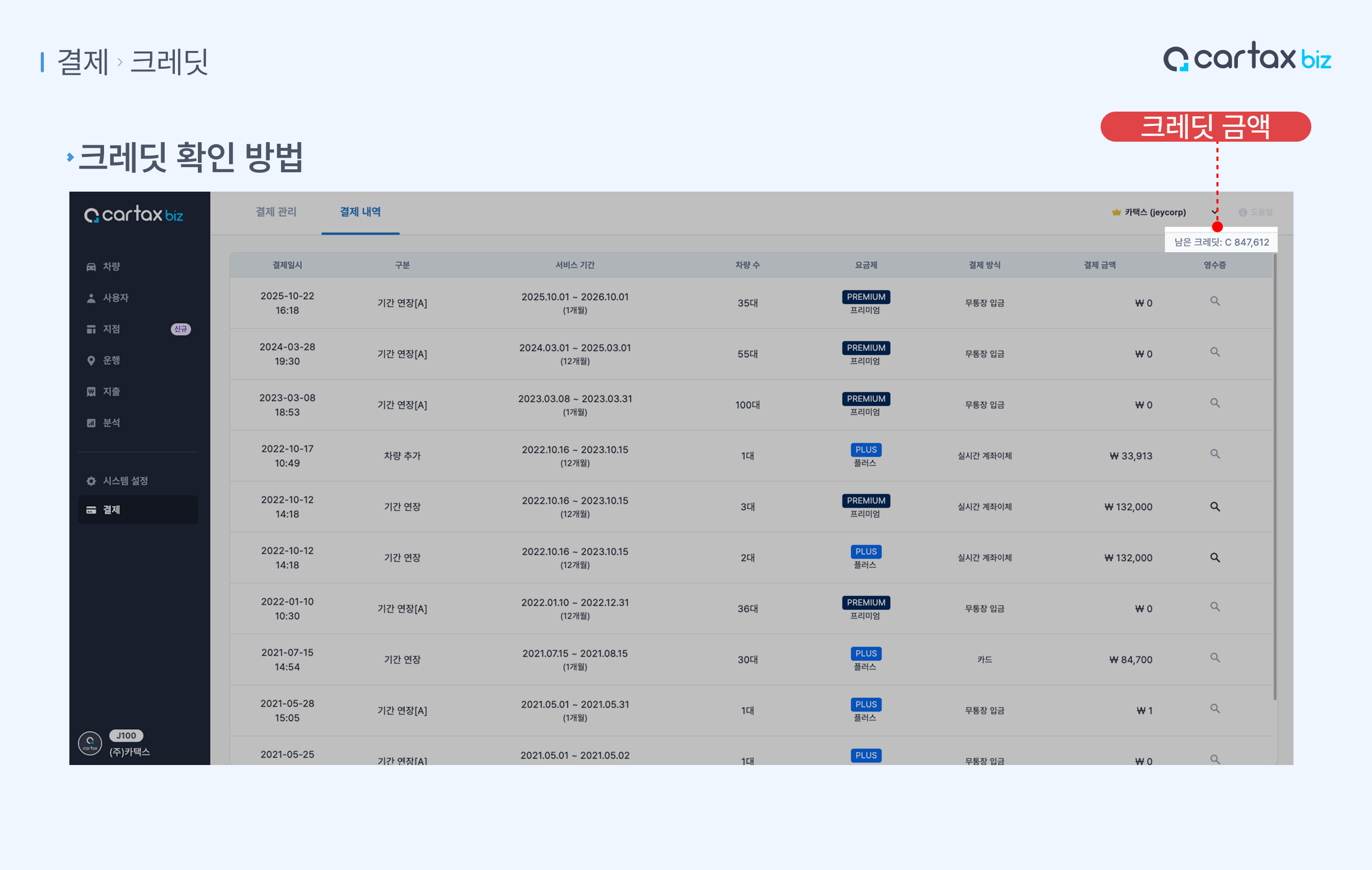 (1) 크레딧계약 정보의 변경*으로 발생하는 재사용 가능한 현금성 포인트입니다.*환불, 차량 수(라이선스) 변경1) 크레딧 적립차량수(라이선스) 감소요금제 다운그레이드적립된 크레딧은 다음 결제 때 포함 결제2) 크레딧 사용차량수(라이선스) 추가요금제 업그레이드3) 크레딧 환불카택스 사용 종료 시, 고객센터 문의를 통한 환불 진행