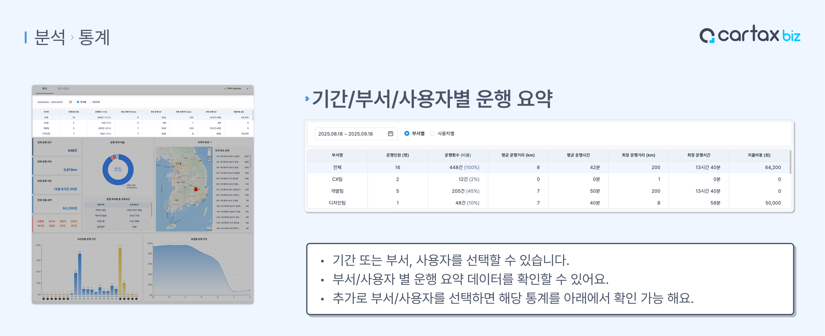 기간별 부서 또는 사용자별 운행 통계를 한 눈에 확인할 수 있는 화면입니다.