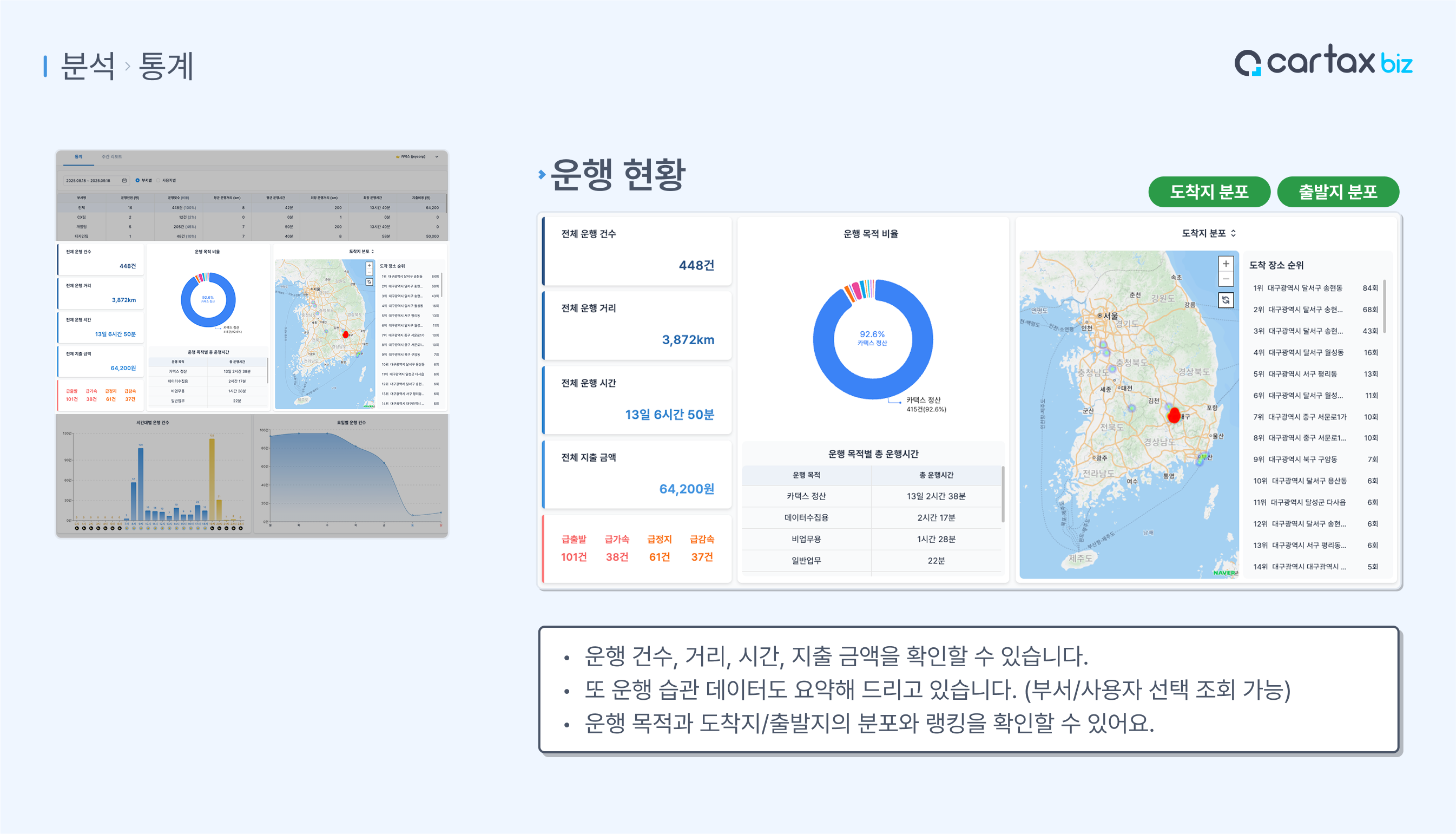 운행 건수,거리,시간,지출 금액,운전 습관,목적별 운행시간,도착지 분포,시간대별 운행 건수,요일별 운행 건수를 확인할 수 있답니다!