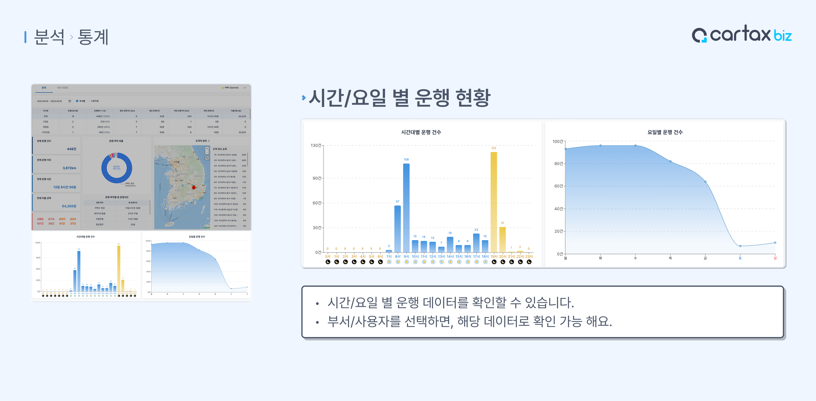 시간/요일별 운행 데이터를 확인할 수 있습니다.선택된 부서나 사용자의 데이터로도 확인할 수 있어요!