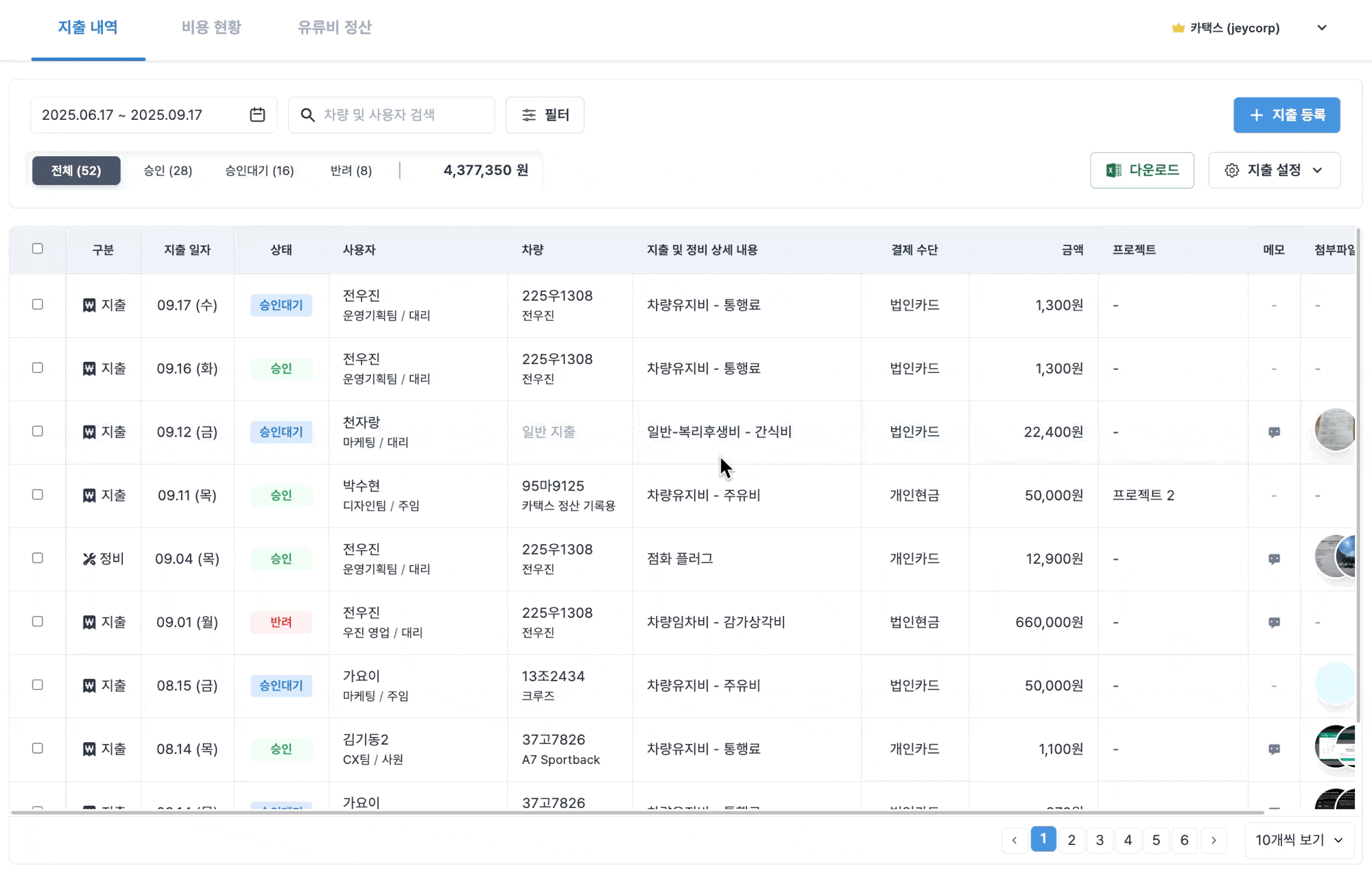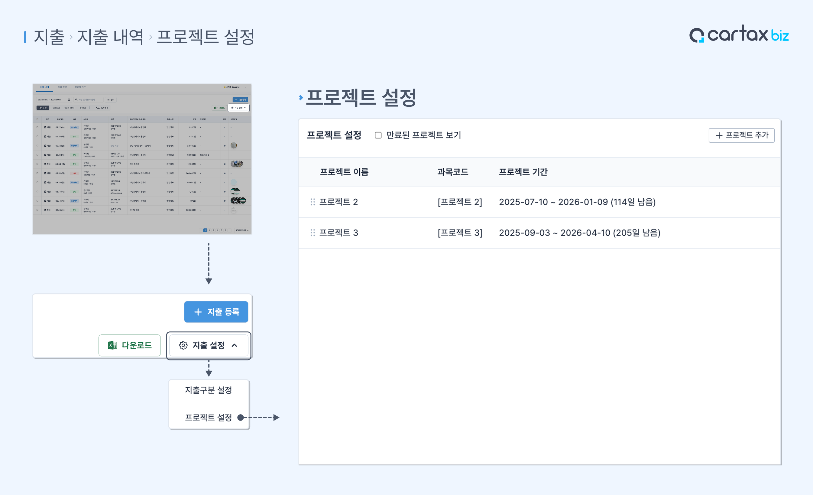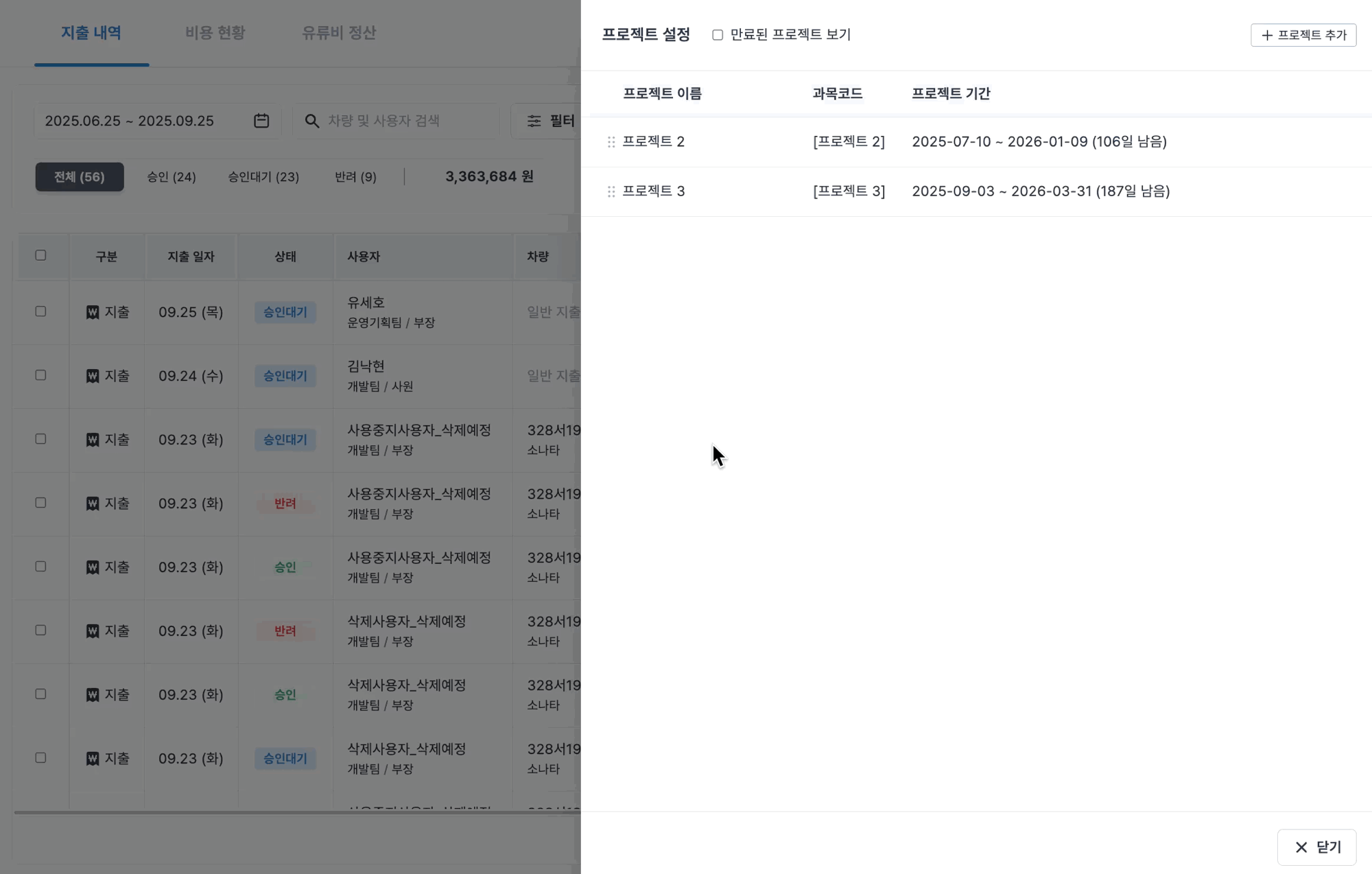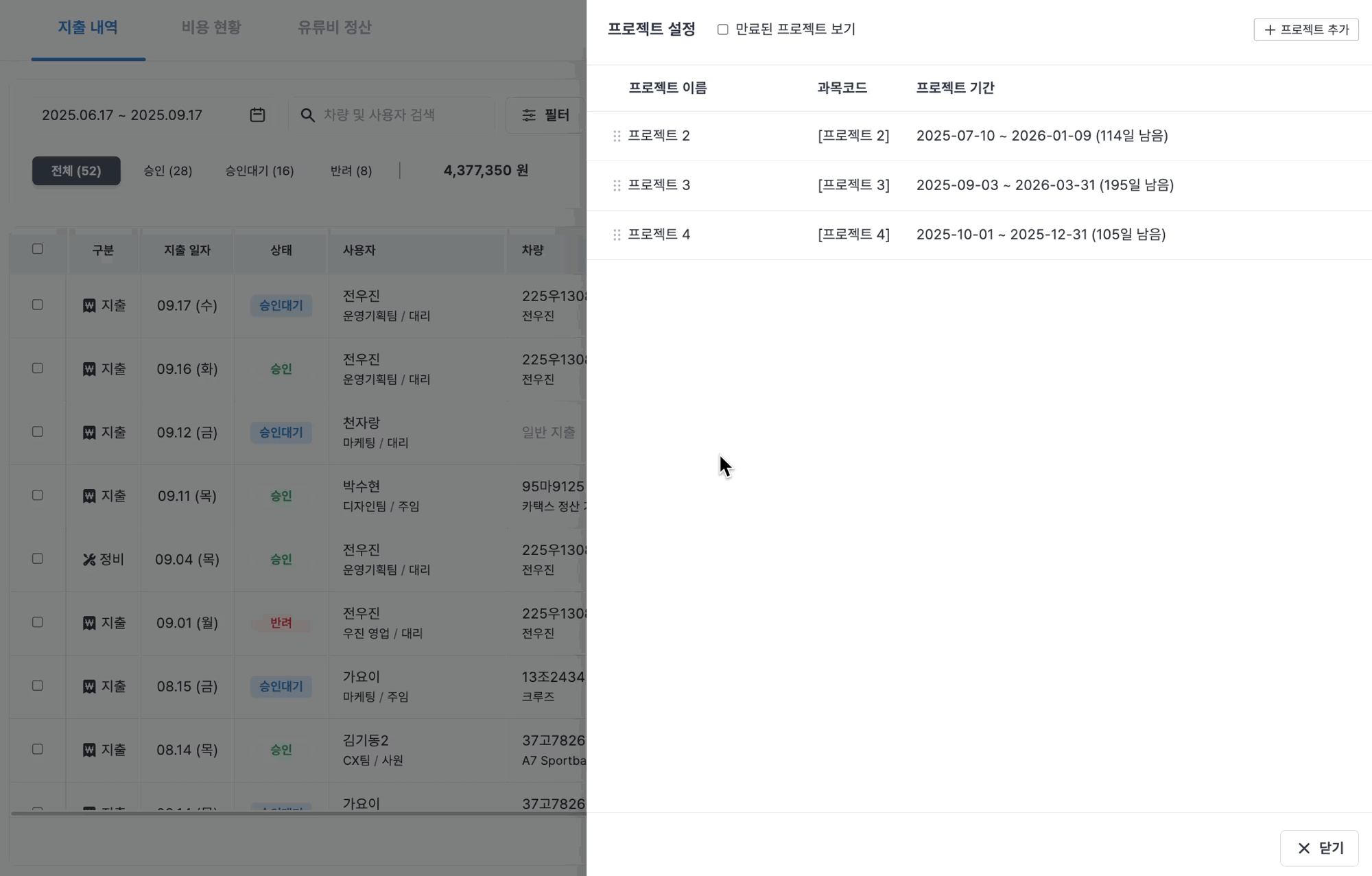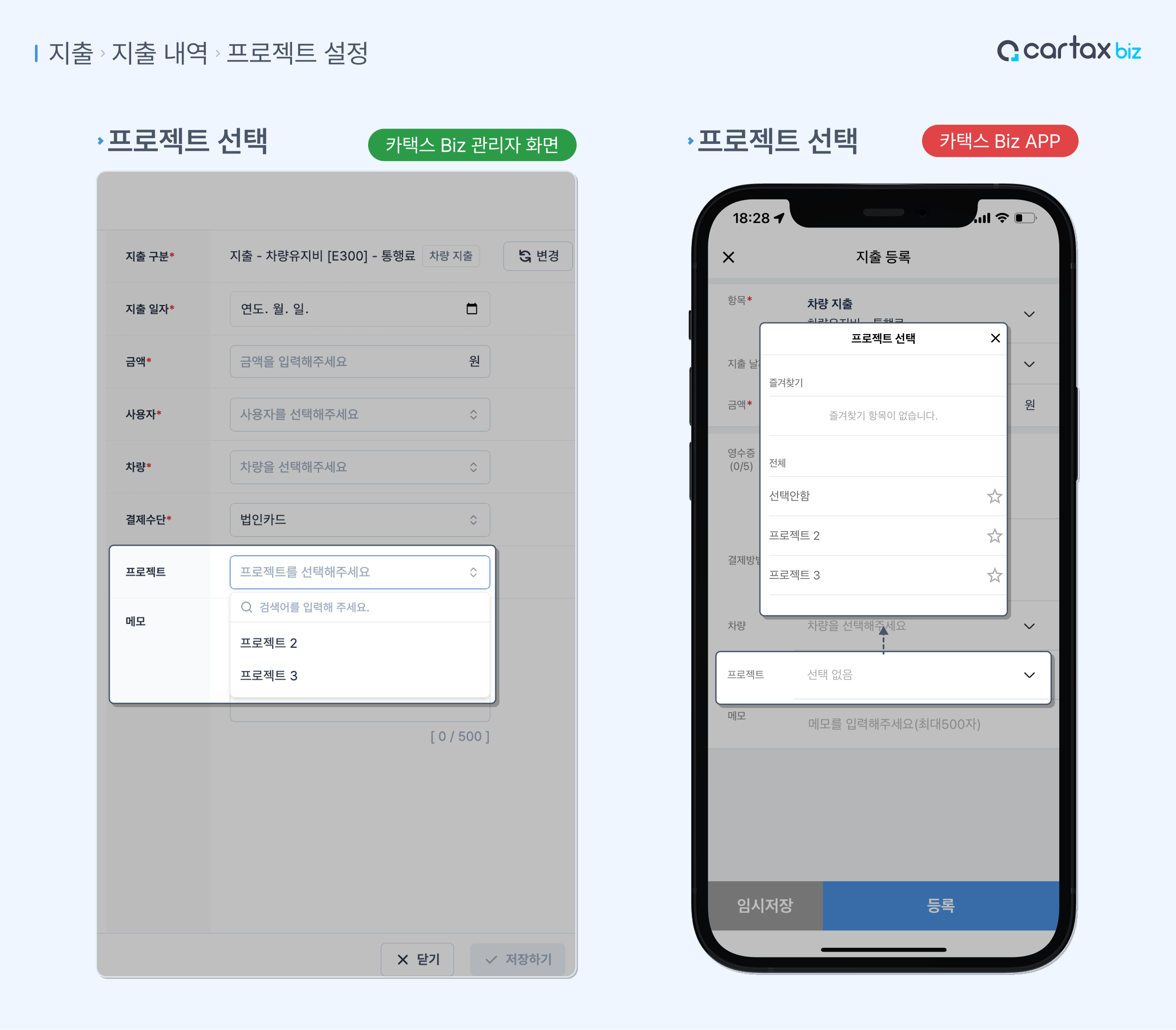 프로젝트는 일반/차량 지출 등록할 때 선택할 수 있습니다.