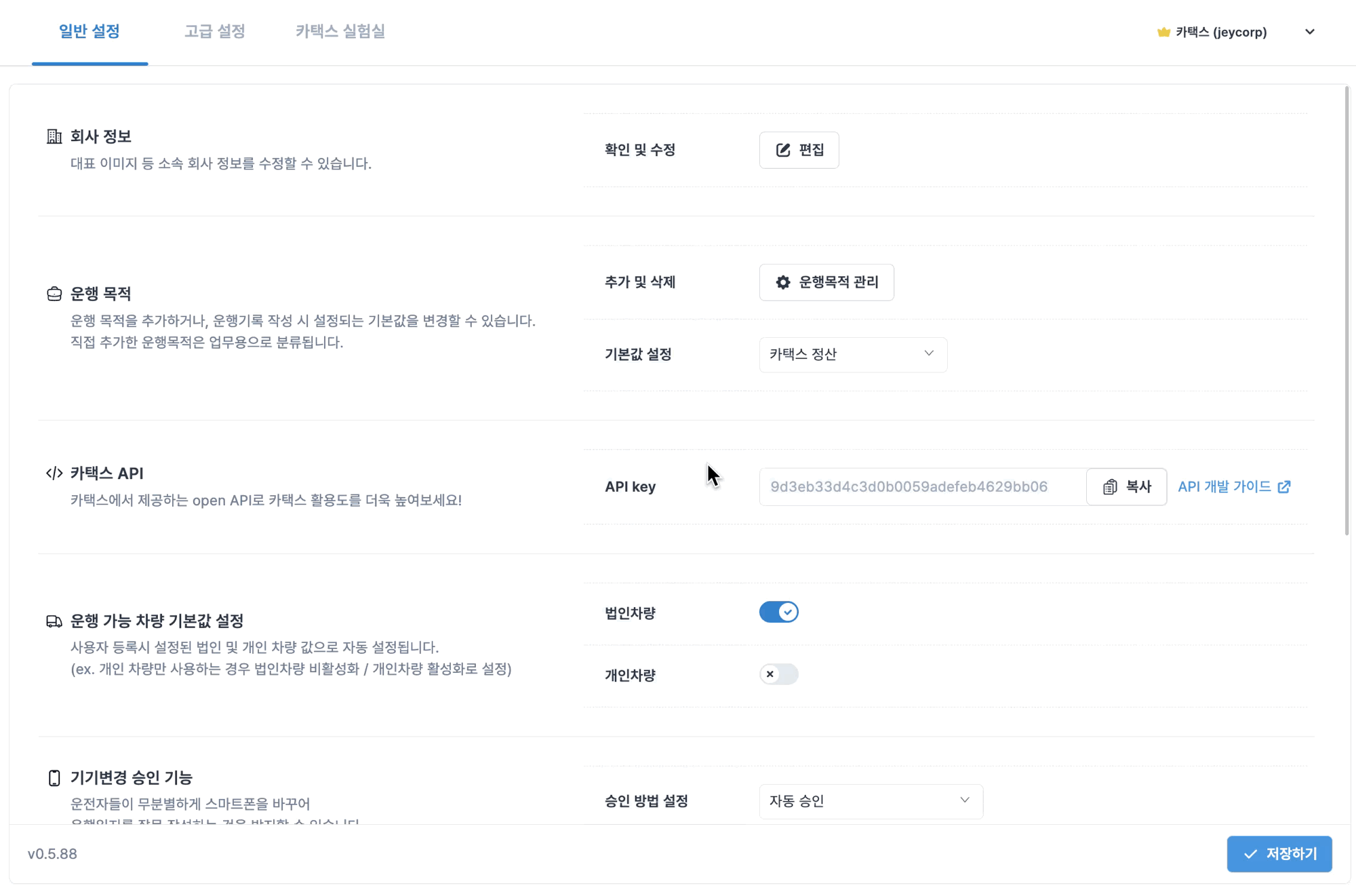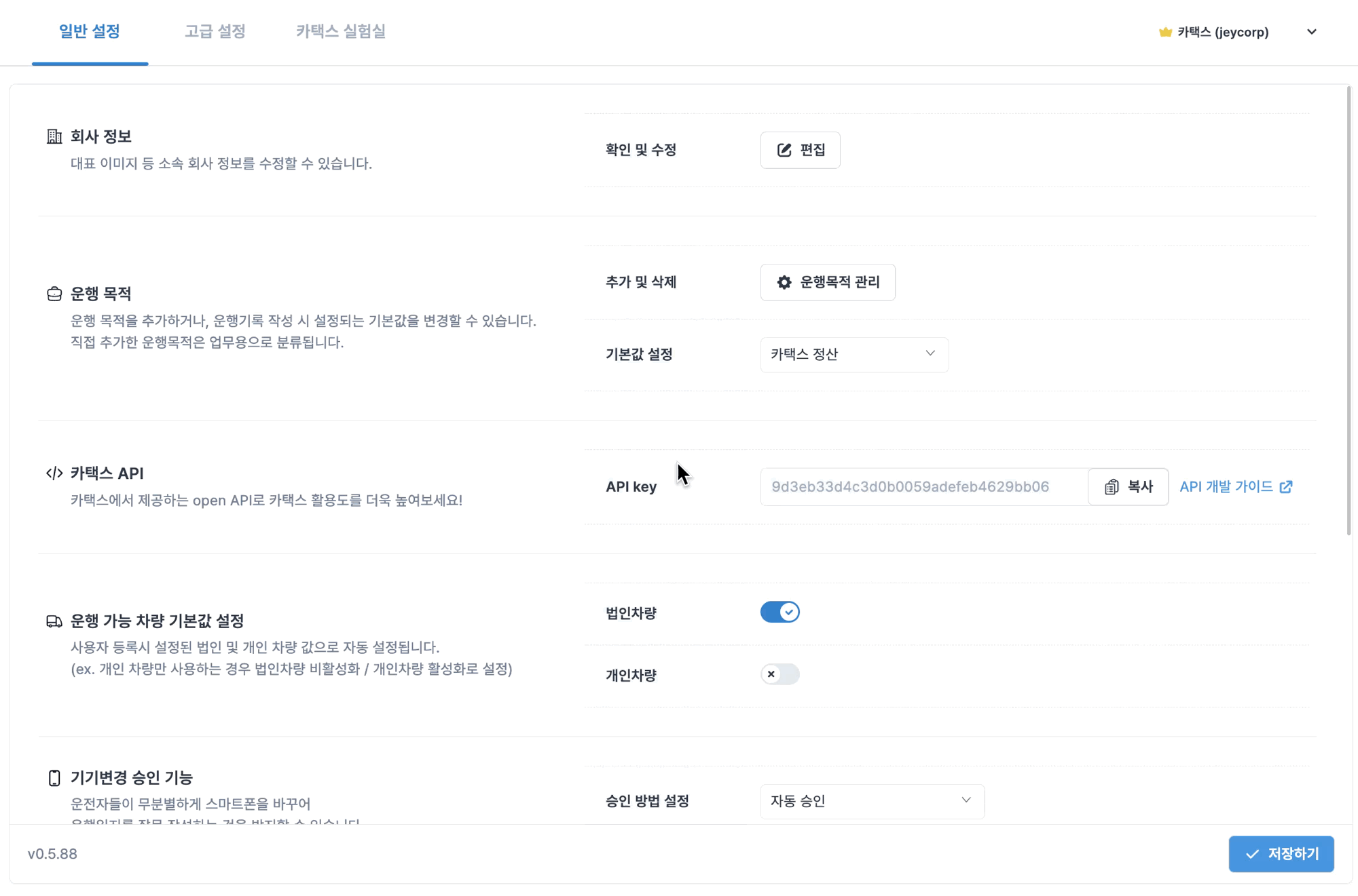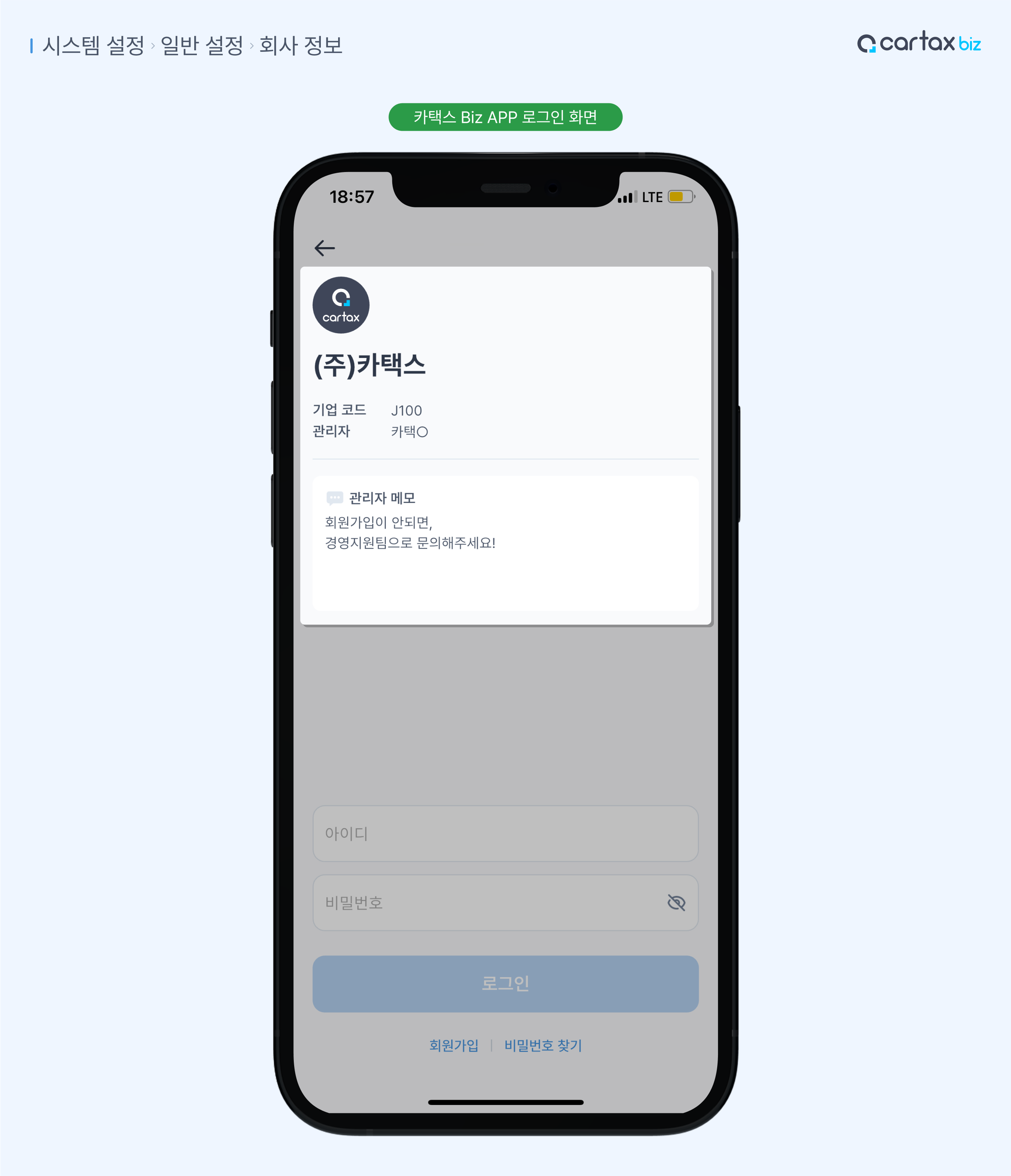 카택스 Biz APP 로그인 화면 회사정보