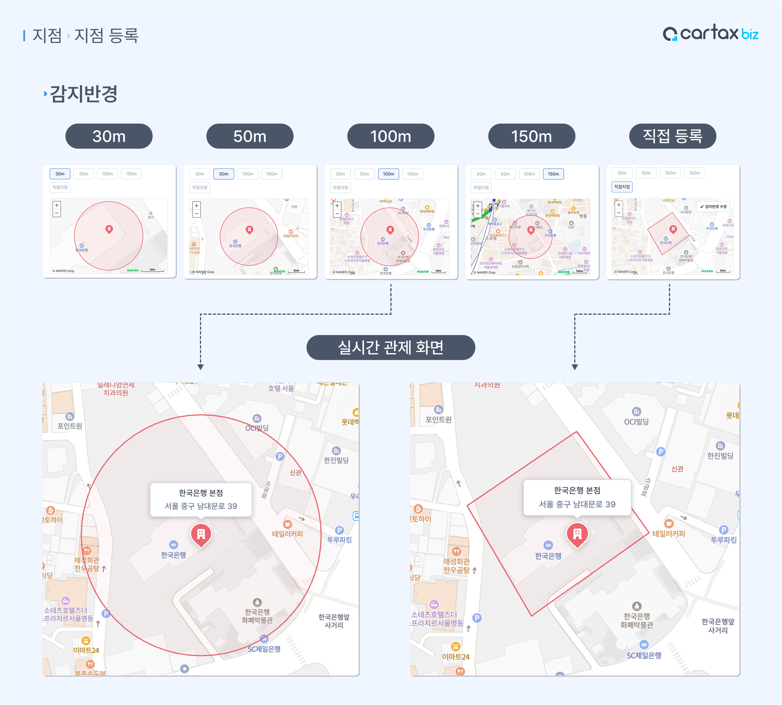 지점 진입/이탈을 감지하는 반경 설정인데요.