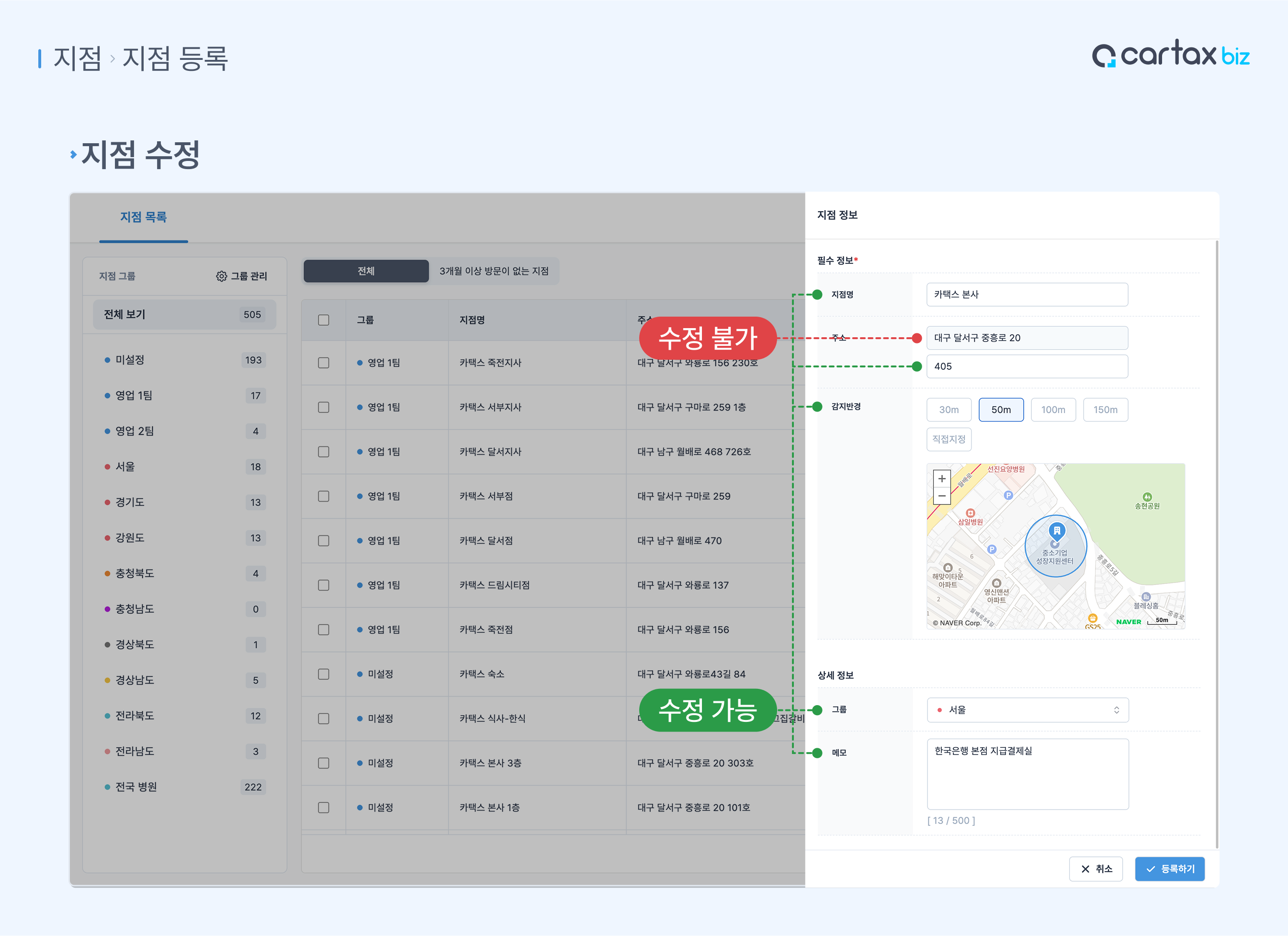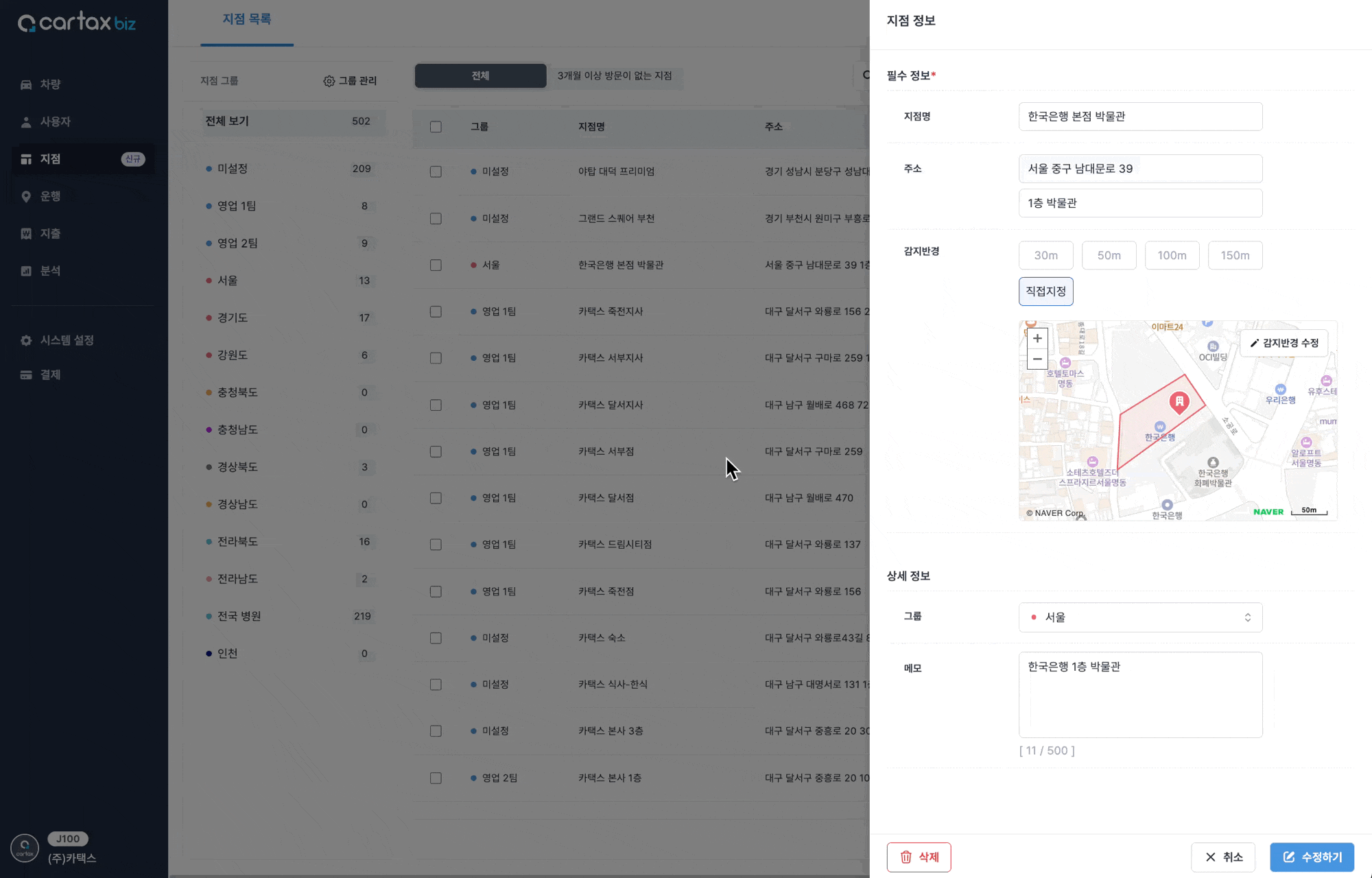 지점명, 상세주소, 감지반경, 그룹, 메모 등 원하는 정보를 수정하세요.
