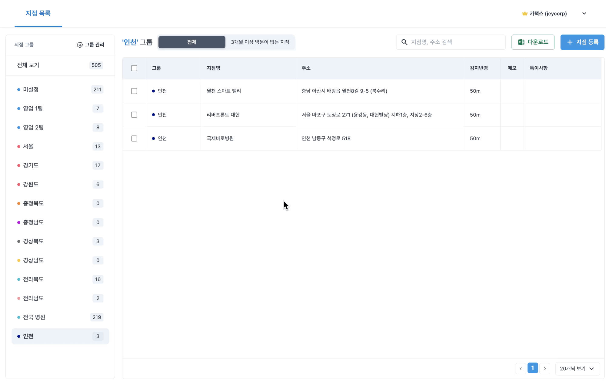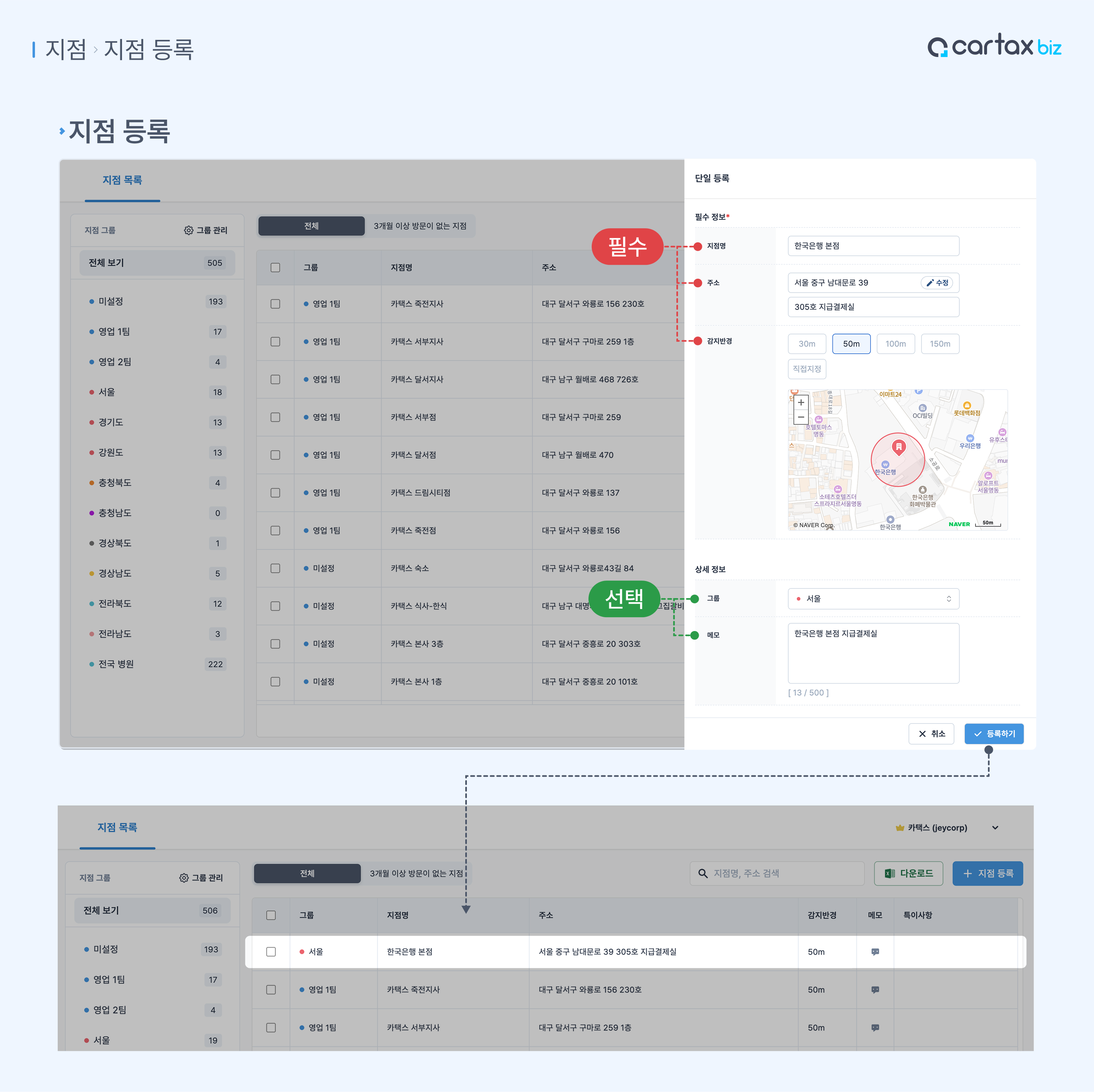 거래처나 지사 등 주요 주소를 지점으로 등록할 수 있습니다.