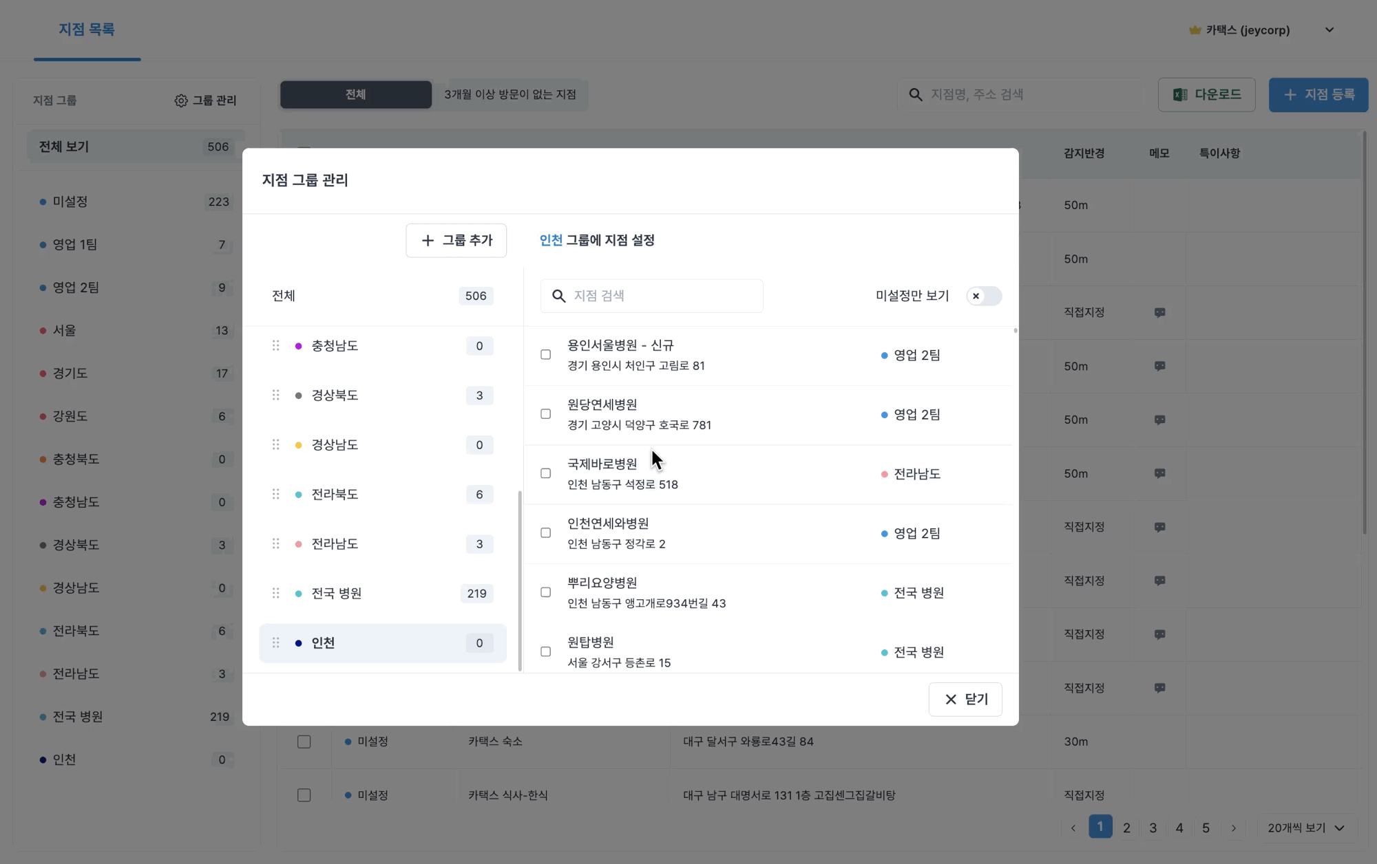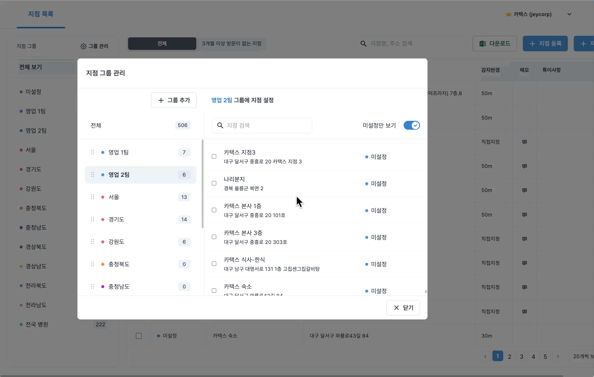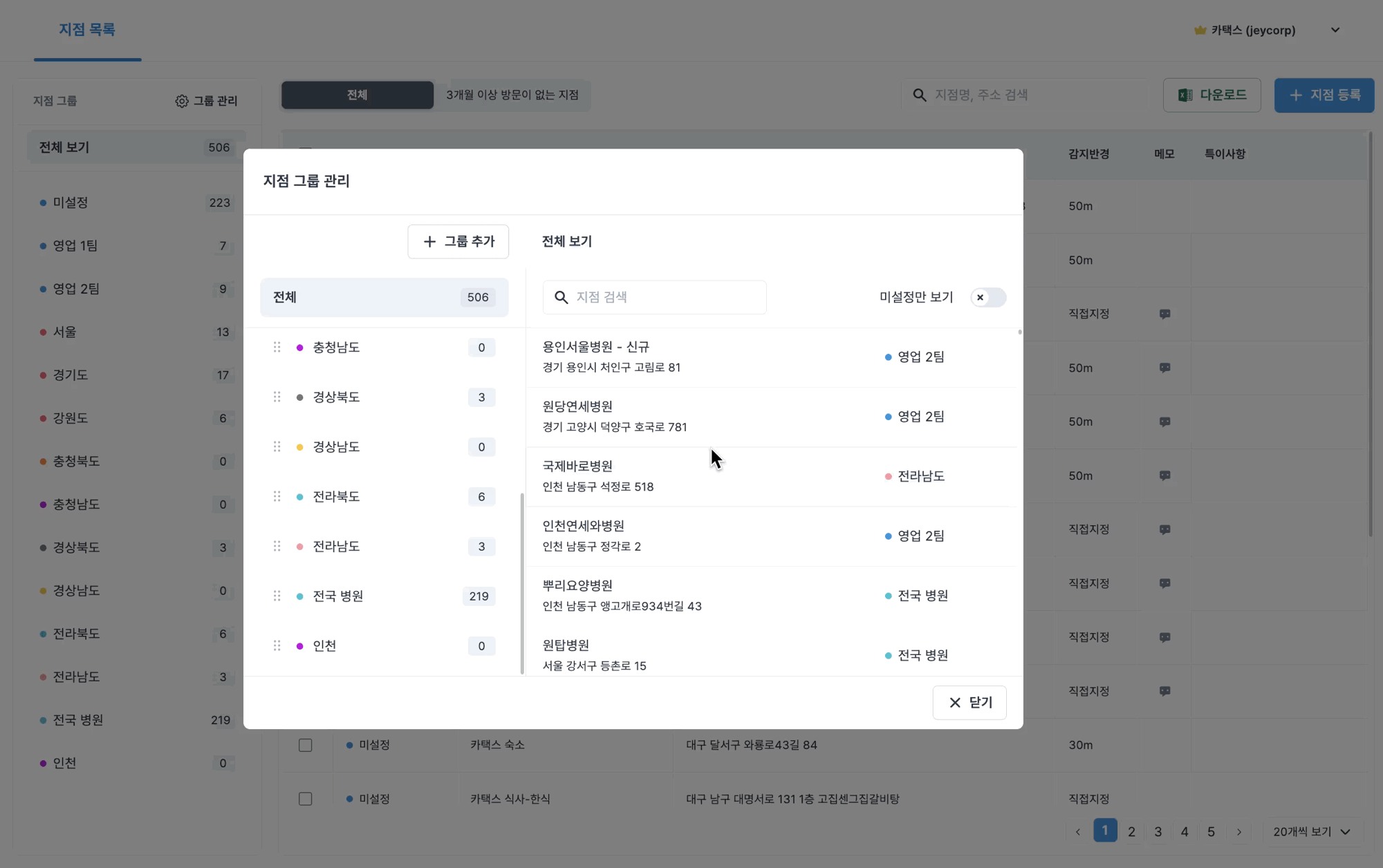 등록된 지점에 그룹을 설정하거나 변경할 수 있습니다.
